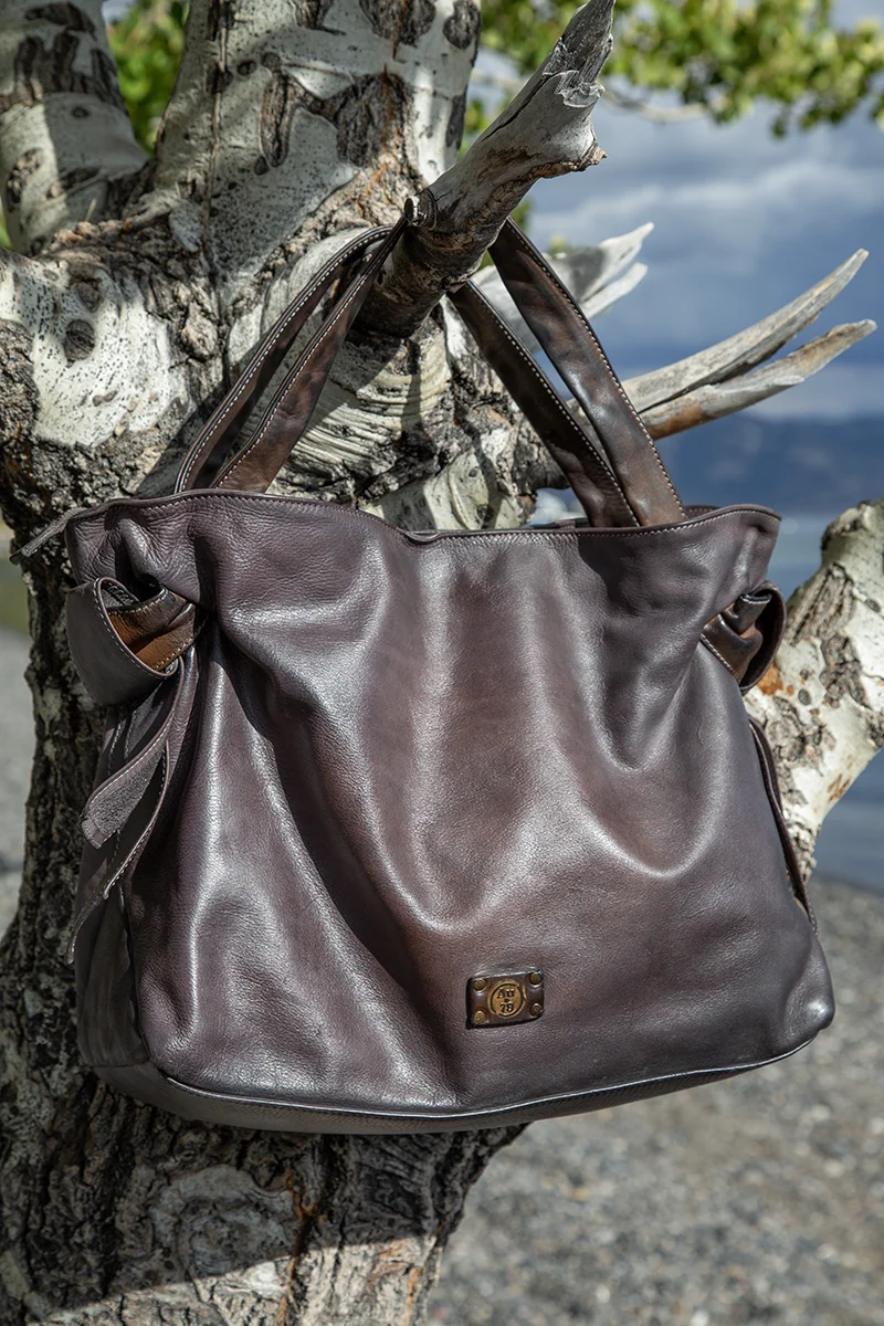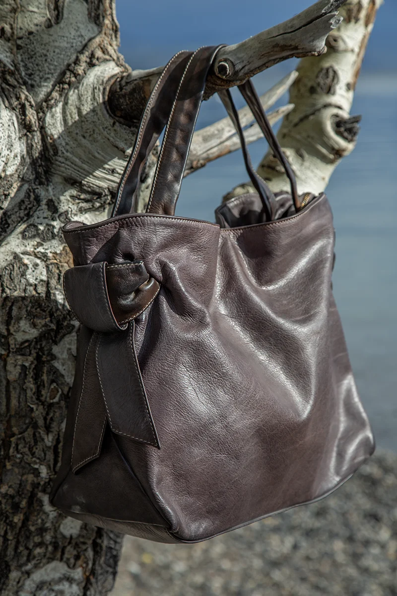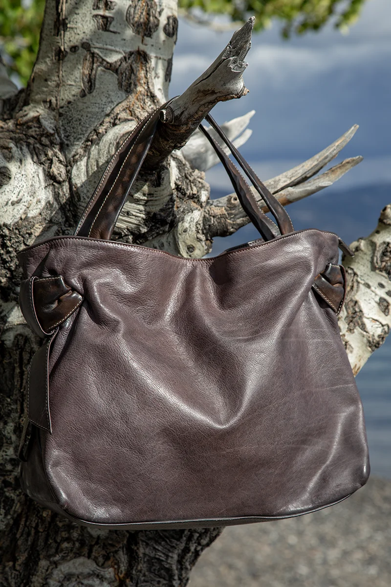 Made in Italy. Wow, what a buttery soft leather beauty! Meet Clarise as she's a stunning workhorse that is lightweight to start so load her up! Soft iron metal leather bold ties on both ends lead up to a dual hand or shoulder strap. Top has a full zipper, magnetic snap and interior is cotton lined with two slots for your phone and keys plus a full interior zipper pouch. You will want to hug Clarise as she's as delicious as she looks in the photos! Dimensions: L16" x W5.5" x H12". Shoulder drop = 11". $398.00
