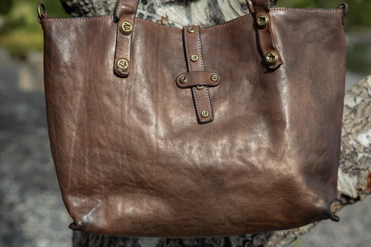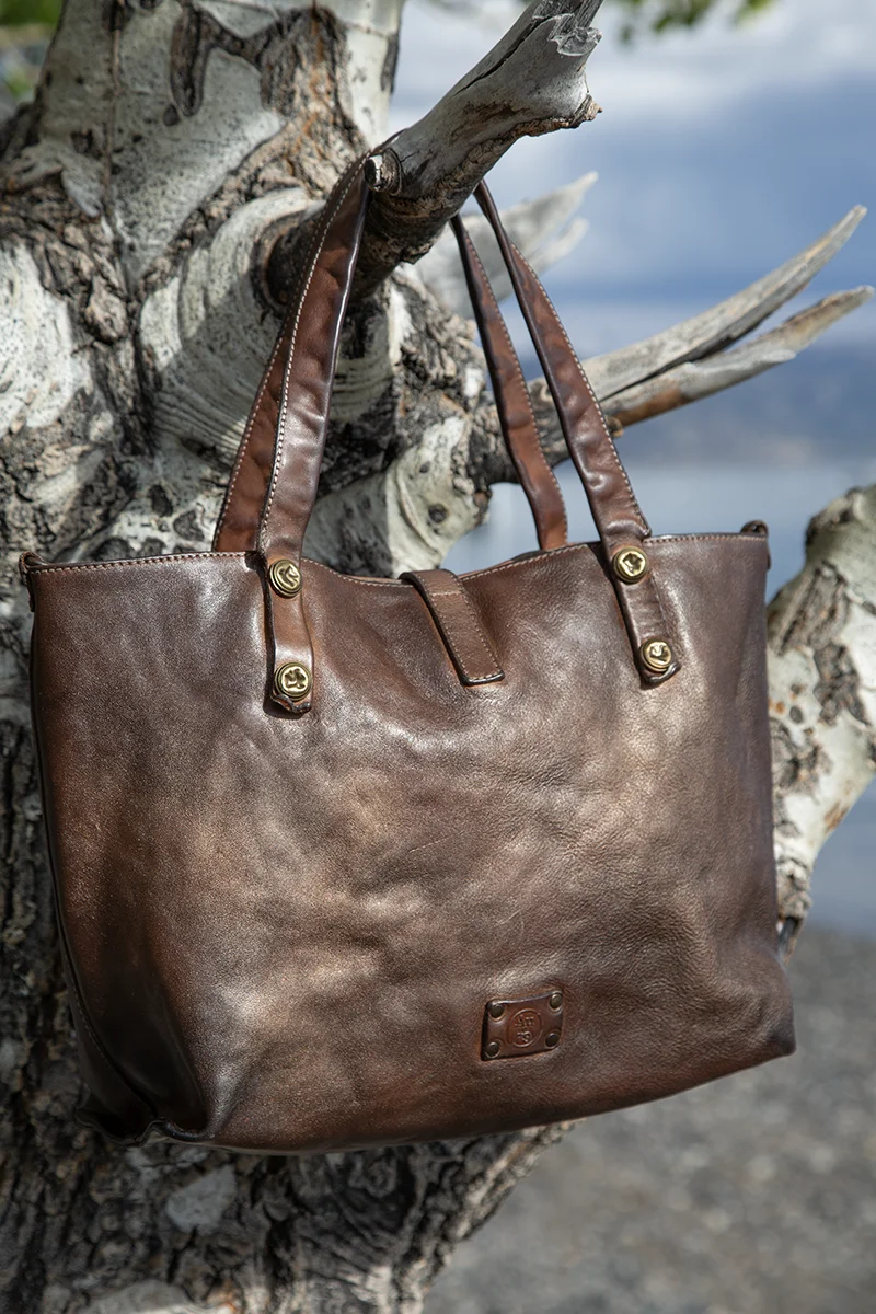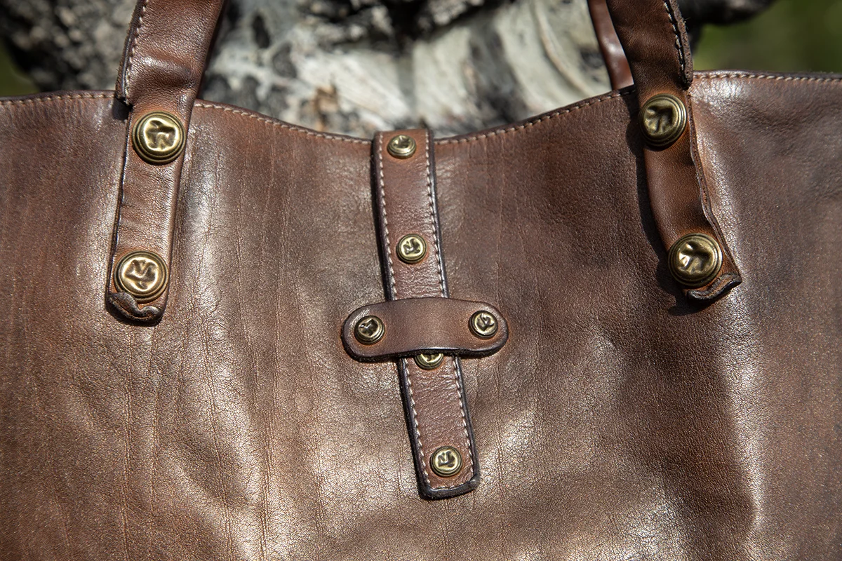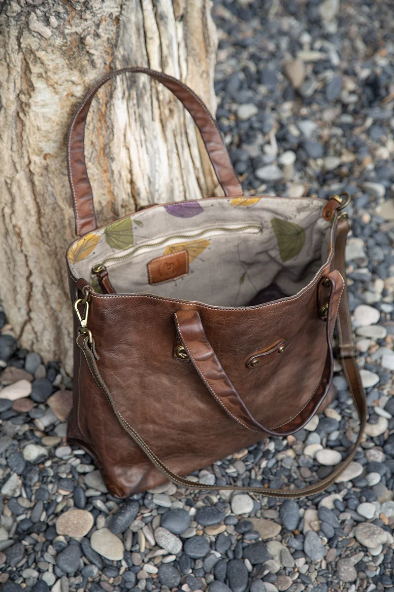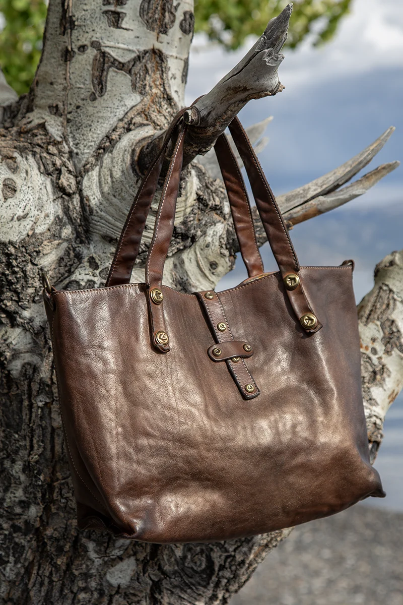 Made in Italy. Lorella is the new workhorse bag from the leather "alchemist" wizards at Alchimia. She is constructed out of gorgeous chocolate brown leather with hammered brass rivets and hardware. The top leather strap easily slips into the front leather loop for closure. Lorella has two shoulder straps or a long one to wear her across your body. She is lined with colorful cotton printed canvas. Her interior offers two open slots for your phone and keys plus a large interior zipper pocket. Lorella also sits upright when you put her down on a table. Easy access to all your daily needs, small laptop and honestly, a terrific companion when you need to stay organized and not compromise your style! Dimensions: 10"H x 17" L x 4.5" W. $398.00