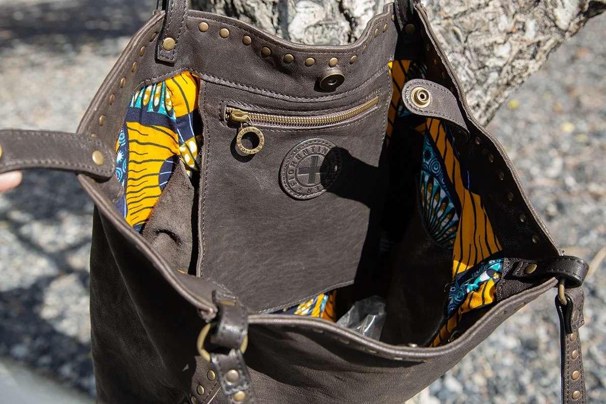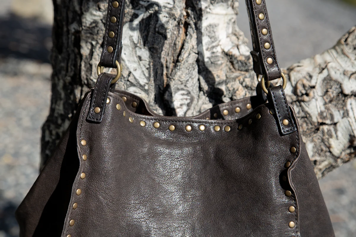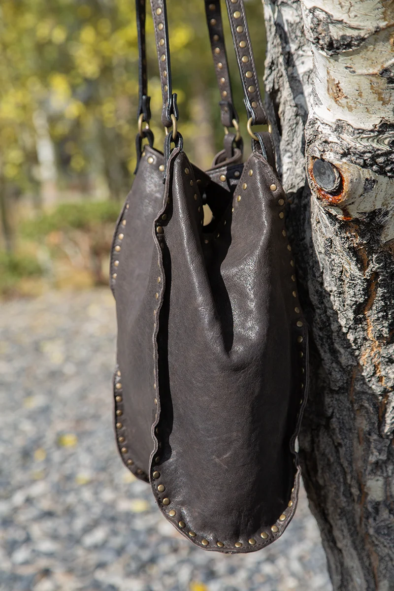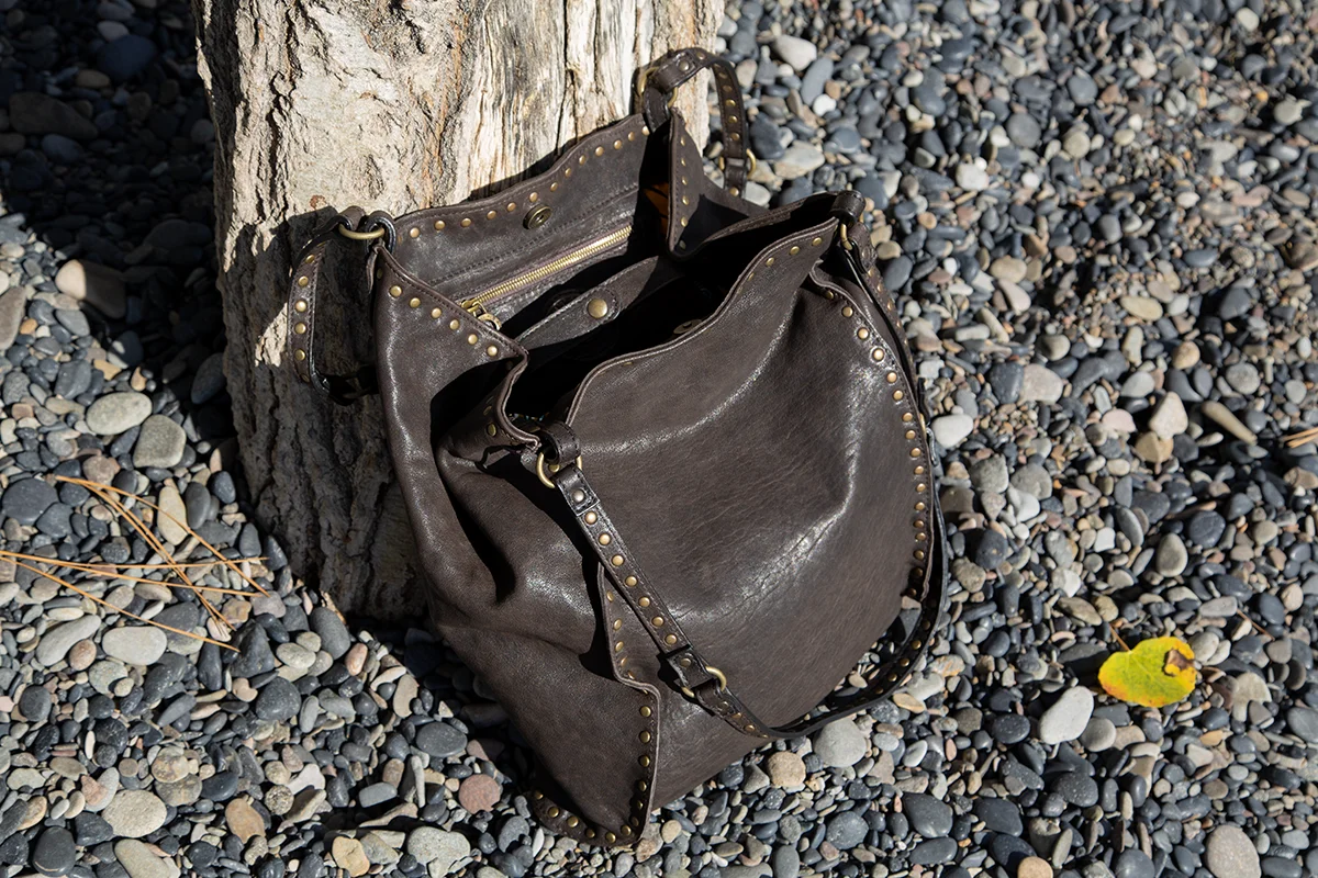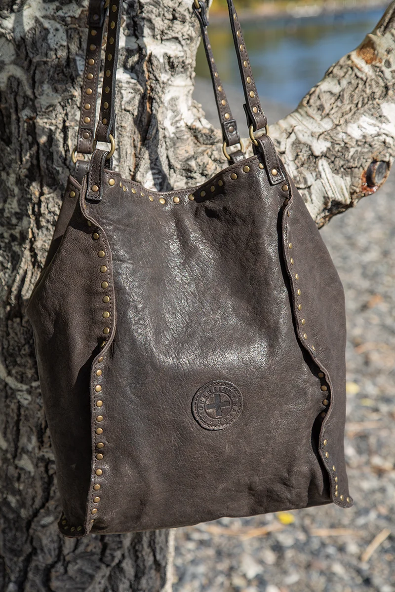 Handmade in Italy. It's like hitting the jackpot when we get more Fiorentini and Baker bags! Constructed of beautiful soft Italian leather and studded design. This hold everything bucket bag is nice and deep with a leather tab and snap closure. Inside zipper pocket is perfect for your phone and other little items. Double leather straps with studs and rings has a 14" shoulder drop. Easy to swing over your shoulder and off you go in fine Italian style! Dimensions: 17" H x 19" W. Top with snapped closed is 9" W. $528.00