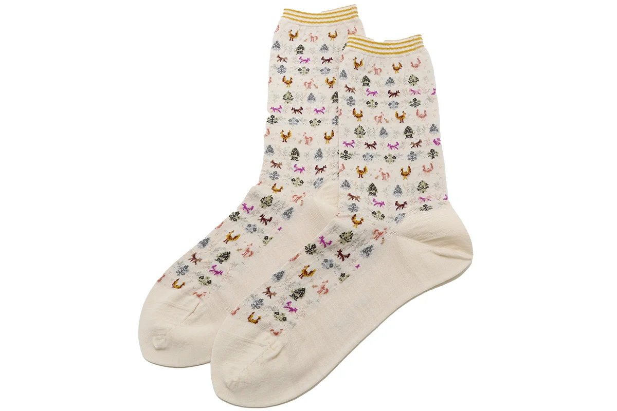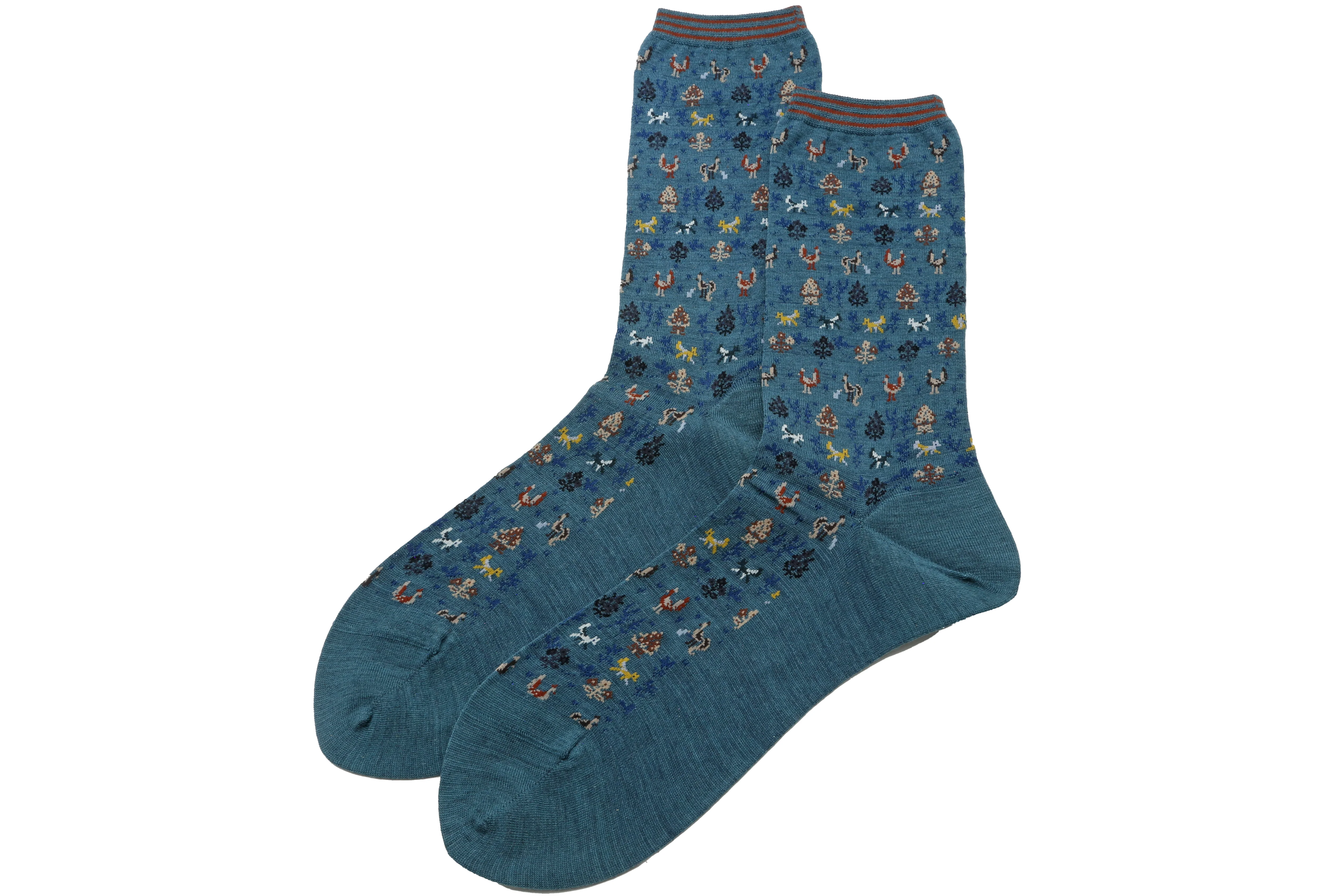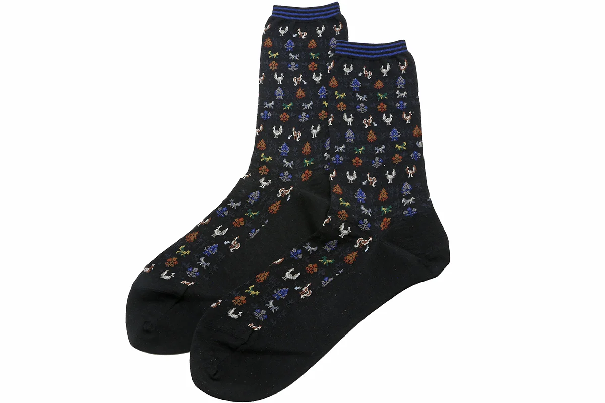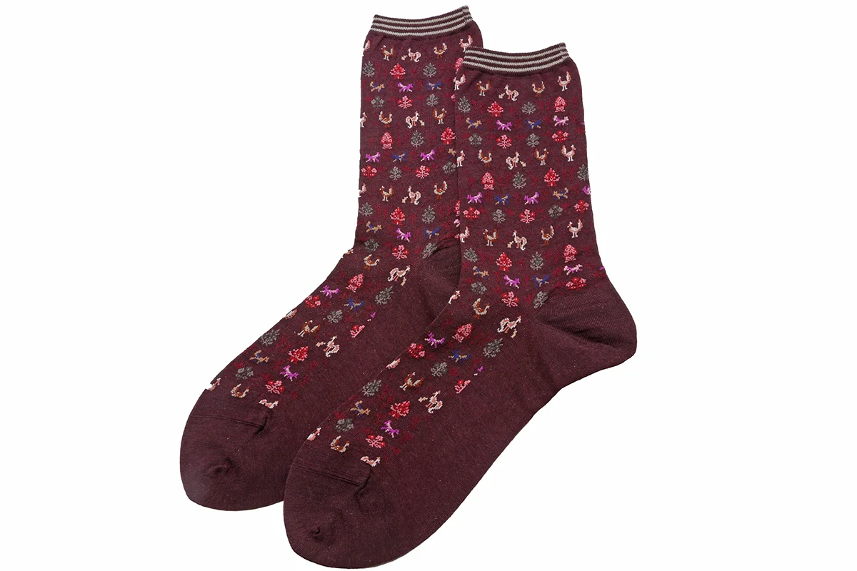 Made in Japan. The most fresh styles are now arriving from Japan for Fall! This new Foresta textile has dozens of dogs, foxes and roosters with wooded trees and folliage. The color combinations are gorgeous and we love the tiny striped tops. Toe to top is 9.25". Forest favorites! 70% wool + 30% nylon. $40.00