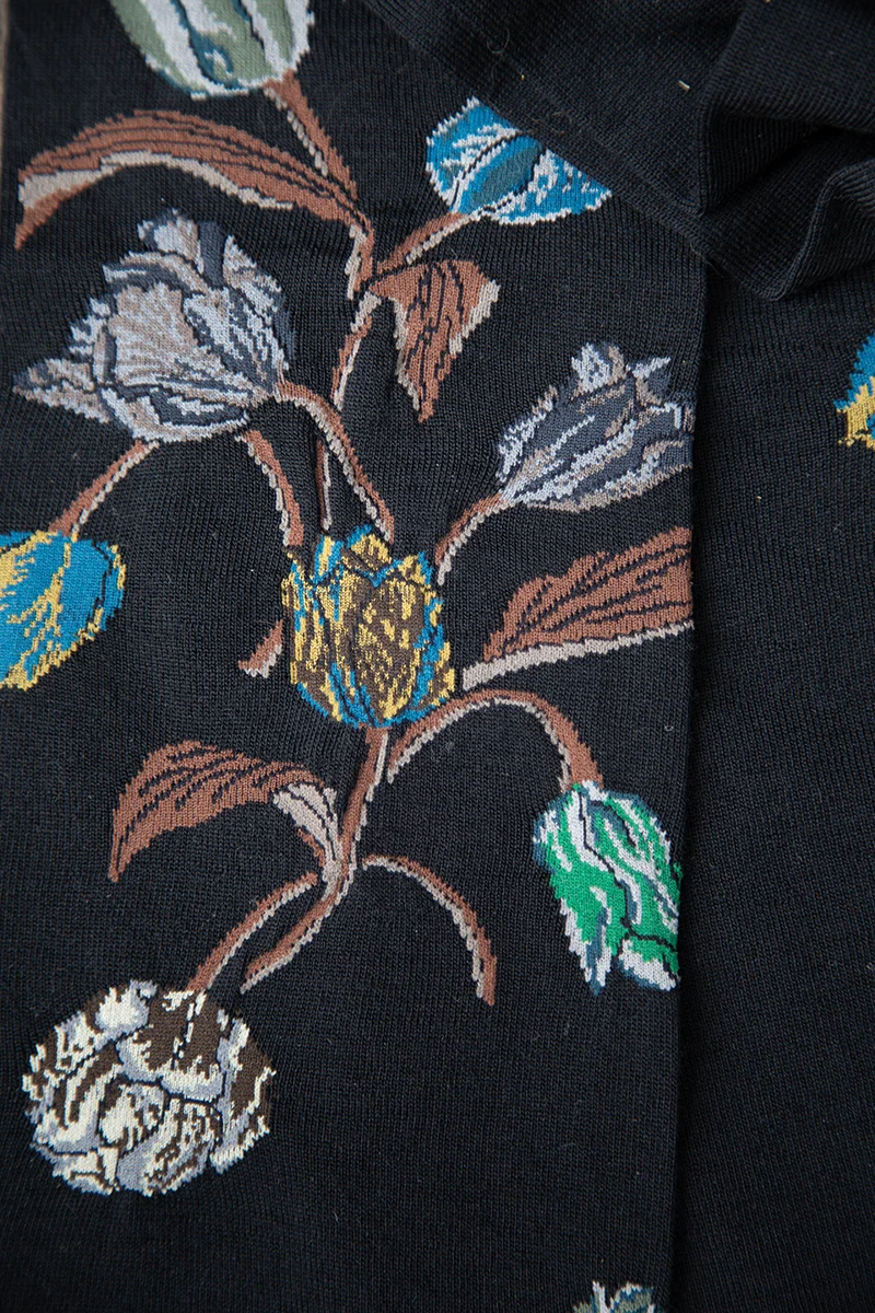 Made in Japan. One of my personal favorite Antipast scarves this season! On one side is beautiful, bold stems, leaves and blooming tulips. The colorful tulips are complimented by the woven bumble bee on the scarf and little bee that hangs from one end. Wrap her once or twice around your neck and more tulips appear from the other size. Wonderful design and warm, cozy and non-itchy wool. Perfect weight to tuck into your jacket or sweater. Did you see the matching gloves? Dimensions: 62" x 4.5". 70% wool + 30% nylon. $98.00