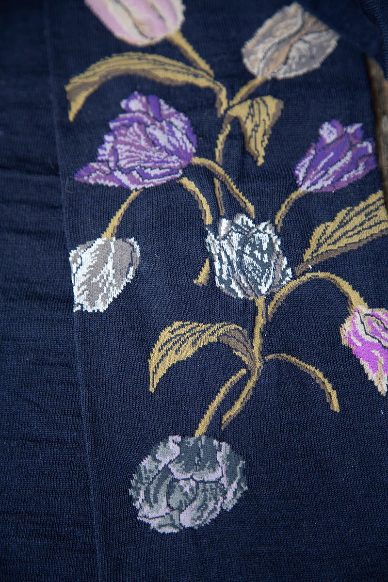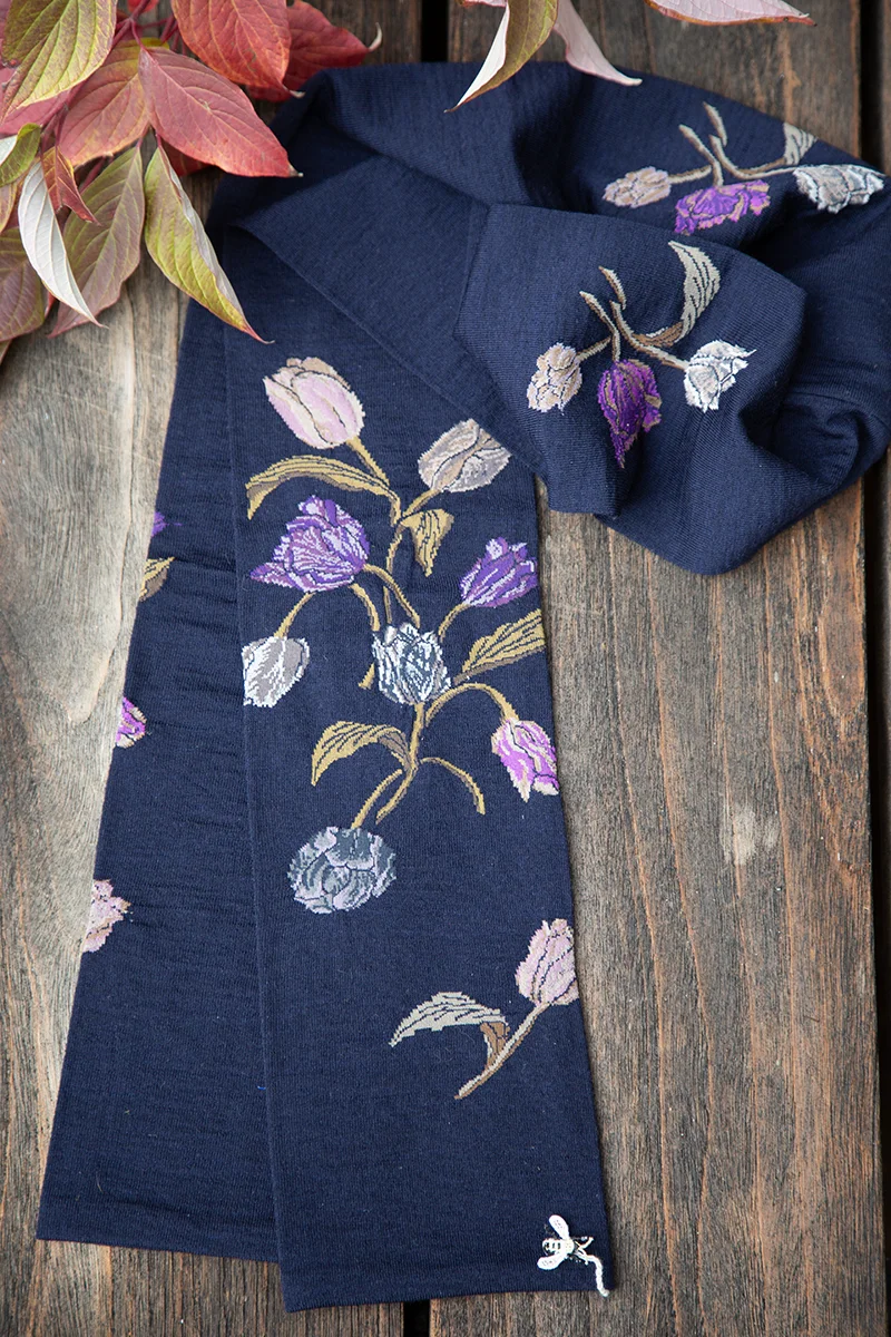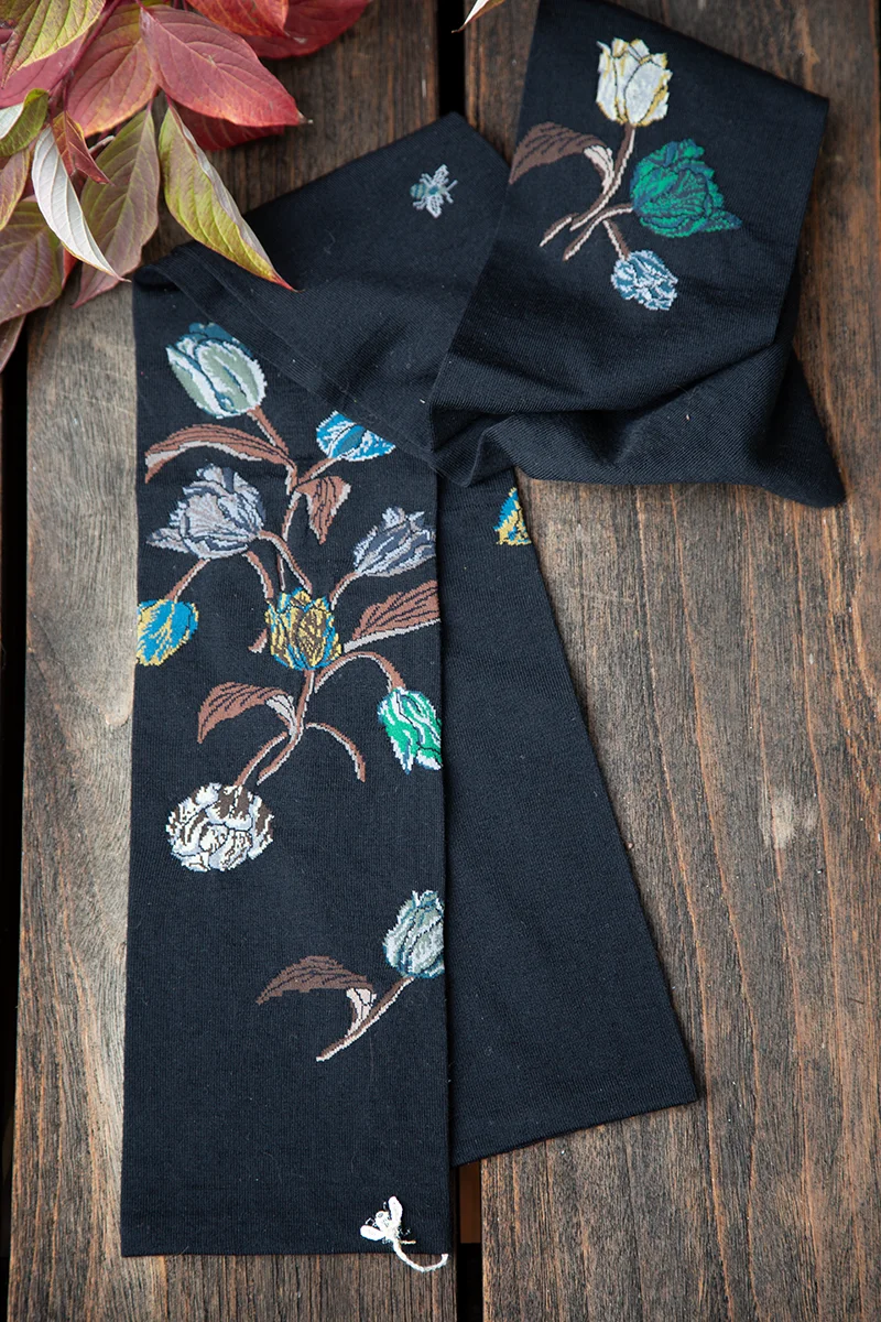 Made in Japan. One of my personal favorite Antipast scarves this season! On one side is beautiful, bold stems, leaves and blooming tulips. The colorful tulips are complimented by the woven bumble bee on the scarf and little bee that hangs from one end. Wrap her once or twice around your neck and more tulips appear from the other size. Wonderful design and warm, cozy and non-itchy wool. Perfect weight to tuck into your jacket or sweater. Did you see the matching gloves? Dimensions: 62" x 4.5". 70% wool + 30% nylon. $98.00