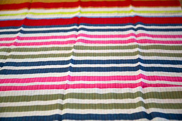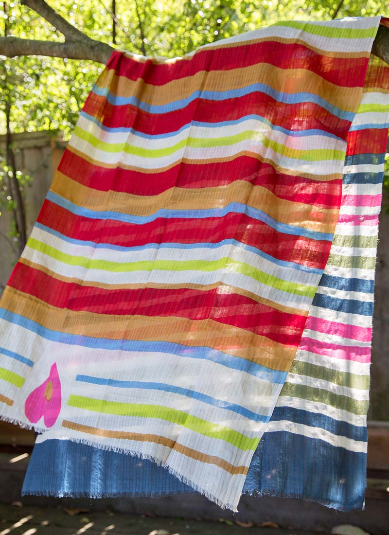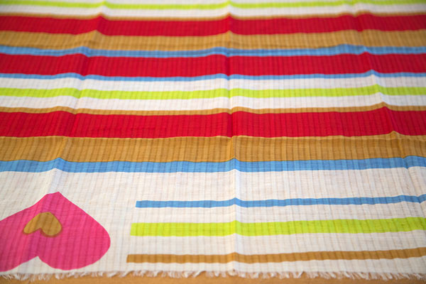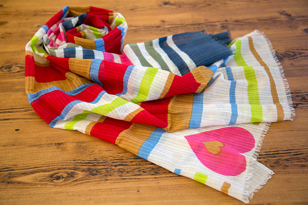 Designed in Denmark and made in India by the finest textile designers around! 30% silk + 70% cotton. The Amore Scarf stole my heart with the big pink heart on the end. Juicy colored stripes in lipstick red, navy, lime green, gold, sage green, Caribbean blue layered with white stripes. Dimensions: 200 x 80 cm.