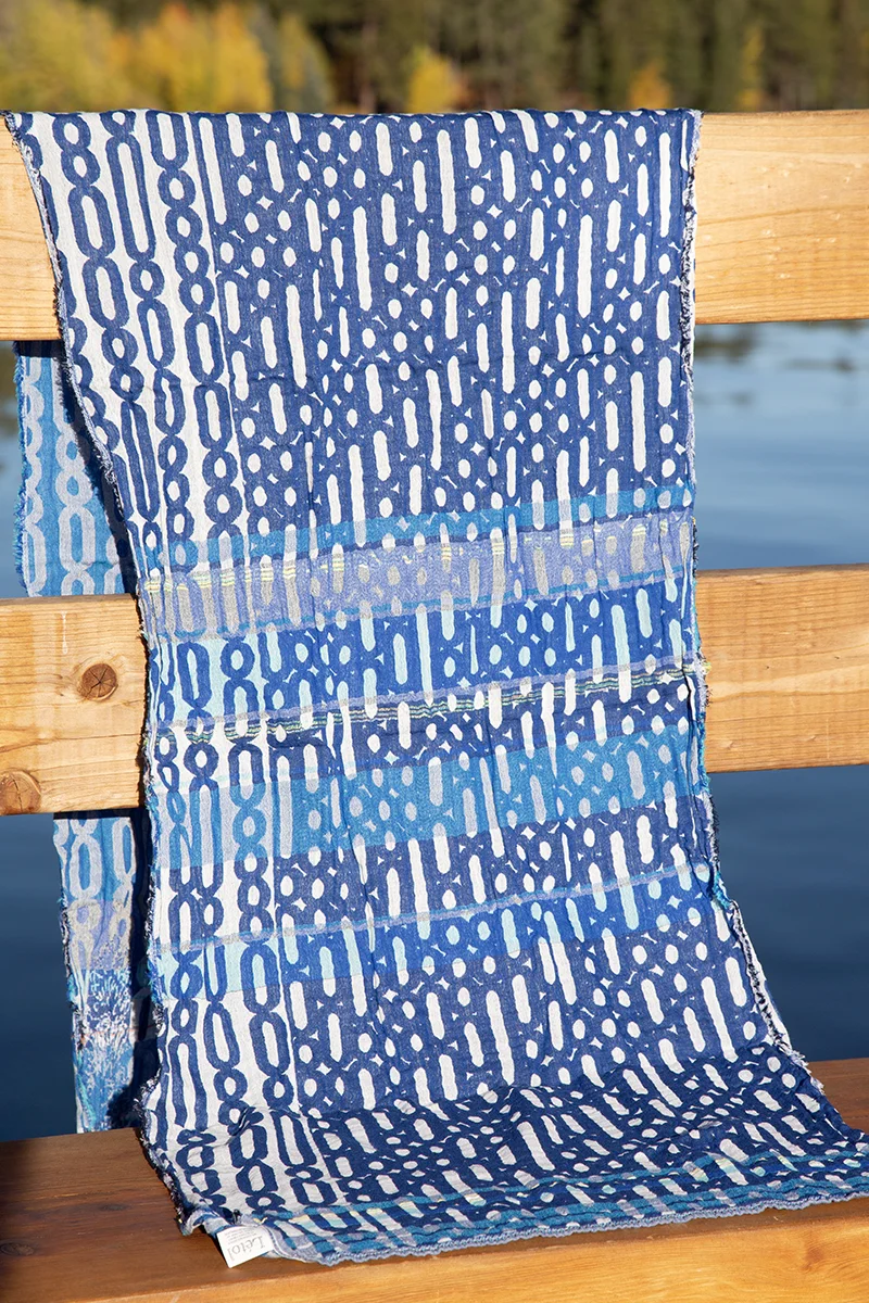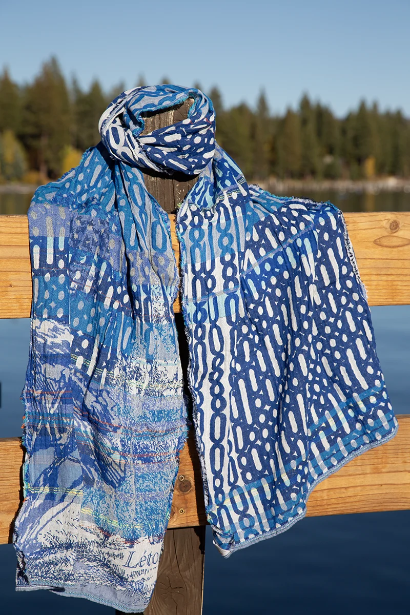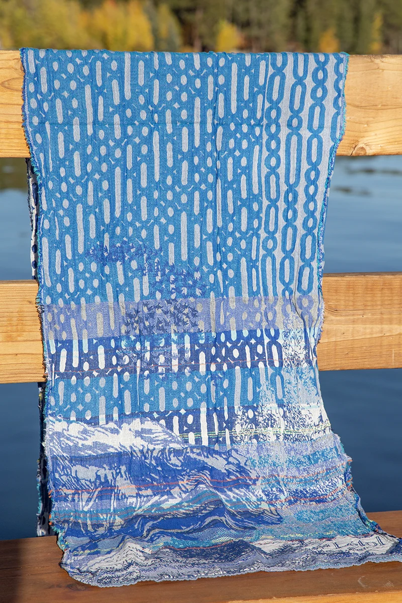 Made in France. Layers of interlaced blue threads make up this gorgeous scarf from France. Blues in indigo, cobalt, ink, lagoon, pearl with accents of orange and lime are woven throughout this stunning textile. Oval shapes, trees, birds and the ocean decorate this lovely cotton scarf. Don't let it be a blue day with this beauty on! Dimensions: 78" x 18". 100% organic cotton. $115.00