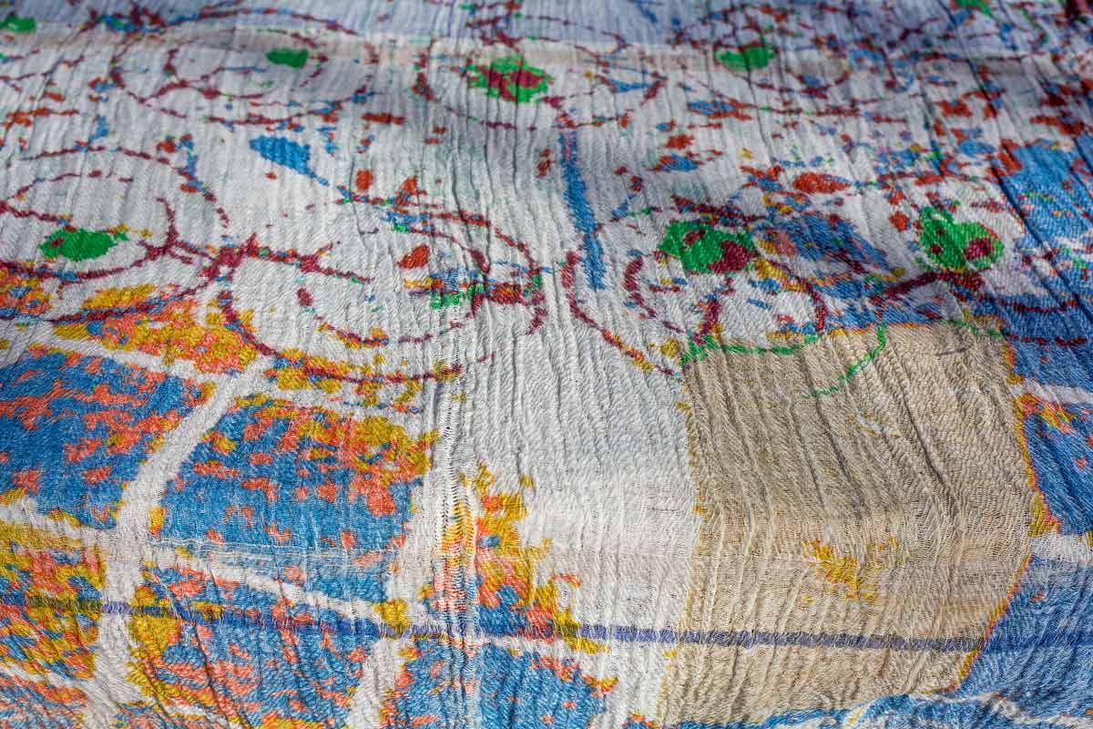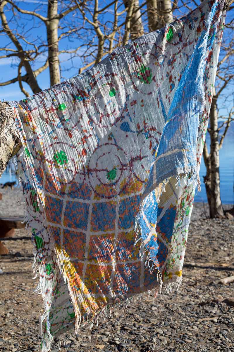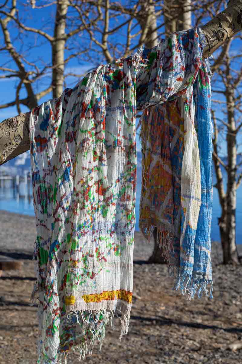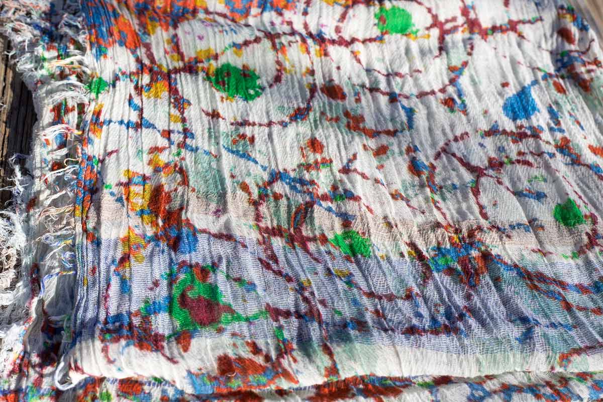 Made by hand in Japan. This one-of-a-kind printed scarf is so dreamy to touch and a delight for your eyes. Gauzy cotton with layers of mosaic colors including kelly green, cobalt blue, mustard yellow and spicy orange. Wonderful all year 'round. 100% cotton. Dimensions: 72" x 46".