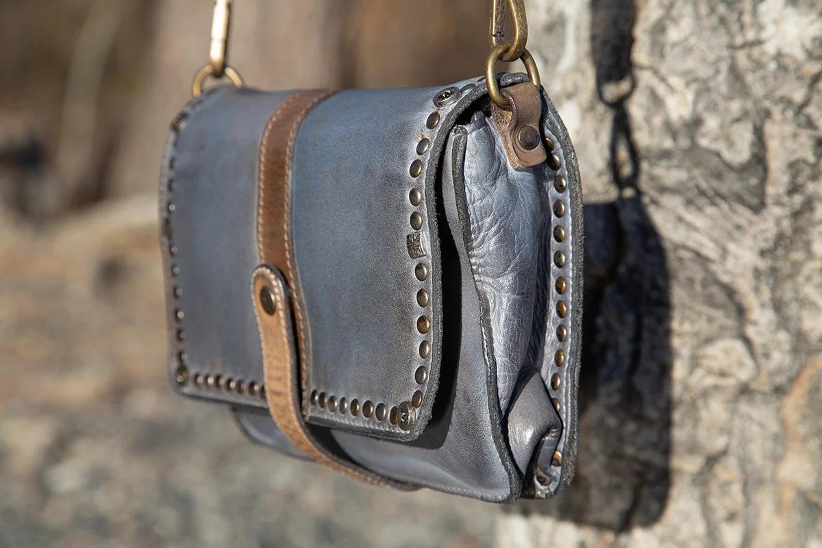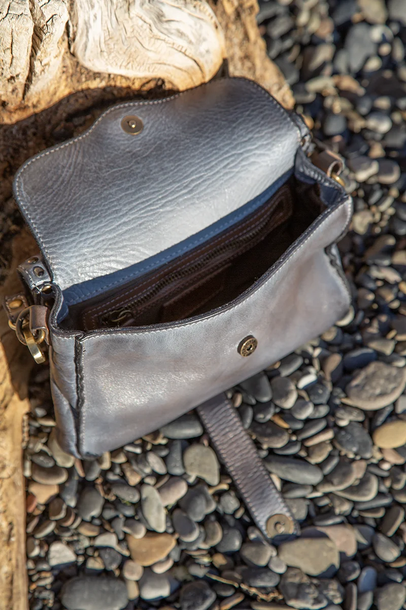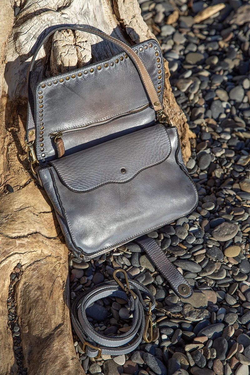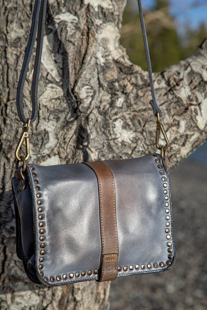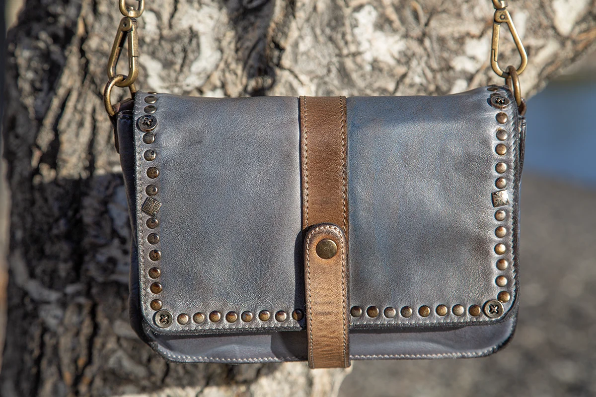 Made in Bologna, Italy. Layla is our new favorite "go-to" bag with all her bells and whistles! A beautiful silvery blue leather is the main body and trimmed in cocoa brown leather with cool studded detailing. There is a short strap and a long strap that are interchangeable. Easily clip them on and off on the side brass hooks. Top flap opens with the brown leather strap and magnetic snap. Inside you will find a zipper compartment hidden under the flap, open slot for your phone in the body of the bag and then an entirely other magnetic snapped compartment with another zipped pocket. Interior is entirely lined with cotton and leather. You are guaranteed to stay organized with Layla as her layout is supreme! Dimensions: 9"L x 7"H x 3"W. $418.00