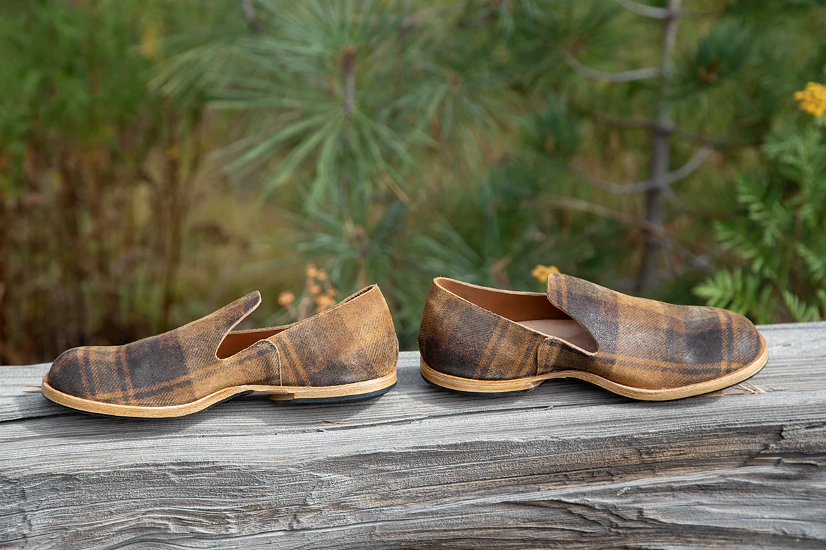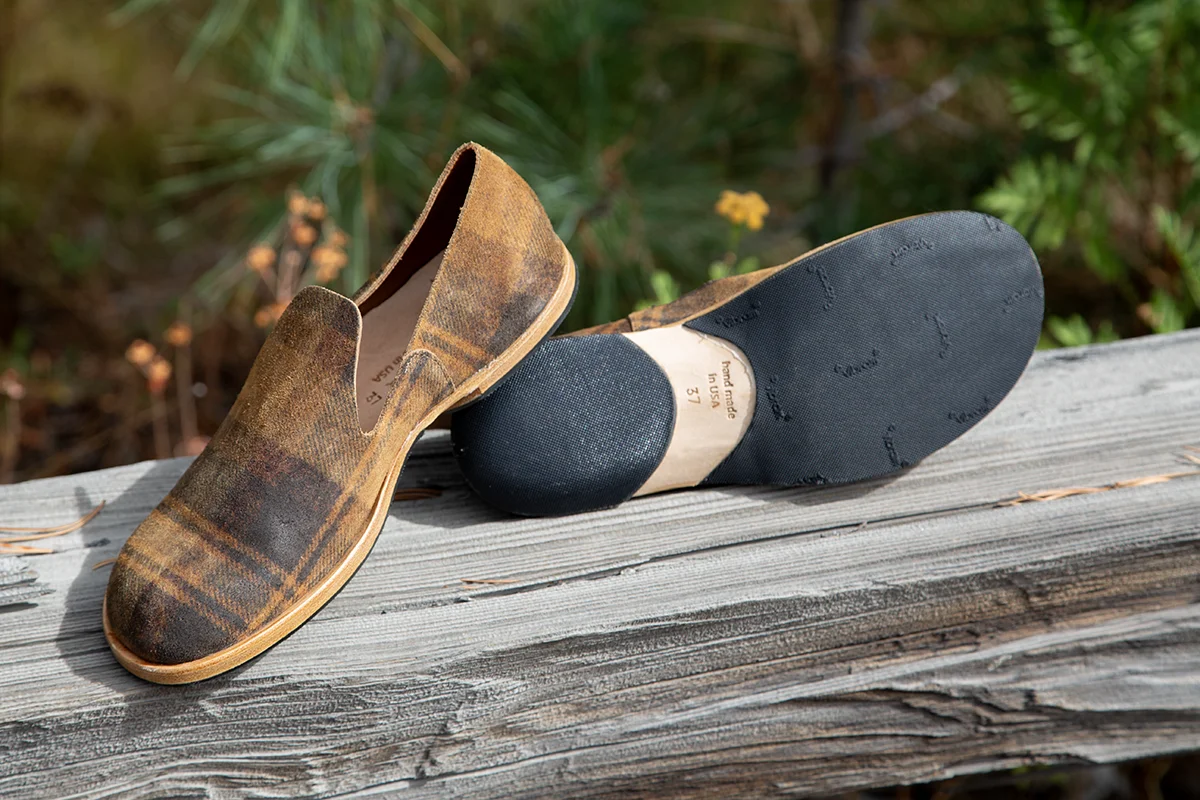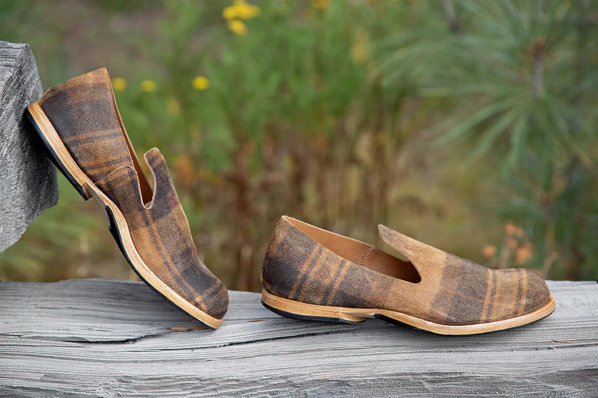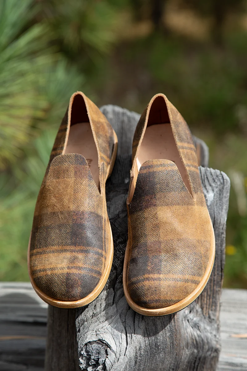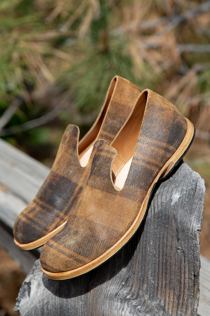 Handmade in California with dreamy leather from Italy. Enjoy the ease of a slip on, the all leather construction, comfortable rounded toe and the trusted Cydwoq arch support on this new Aisle style. This leather is super cool with the layered camel and brown plaid leathers from Italy. Thin rubber on the outsole for anti-slip. Look chic with a virtual piece of art on your feet!    $348.00