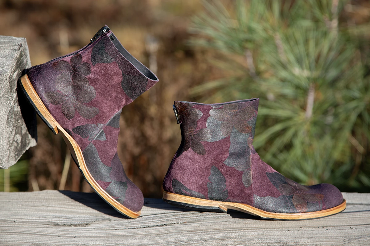 Handmade in California. The new Cydwoq Choir boots are something to sing about! Construction out of purple meets plum suede from Italy. You will love the subtle and gorgeous flowers and leaves to match on the suede. Comfortable rounded toe box with easy back zipper to get her on and off. Textured rubber on outsole for extra grip and Cydwoqs signature all leather construction and arch support.    $438.00