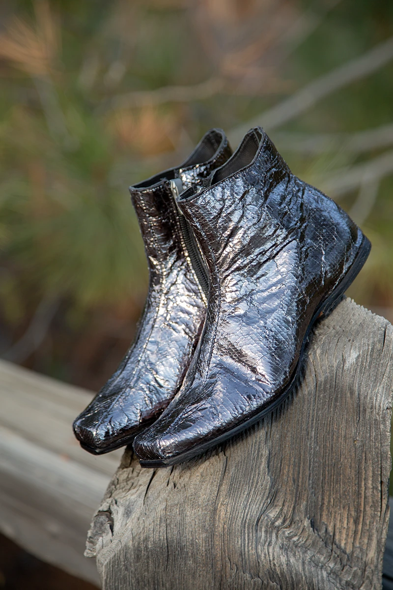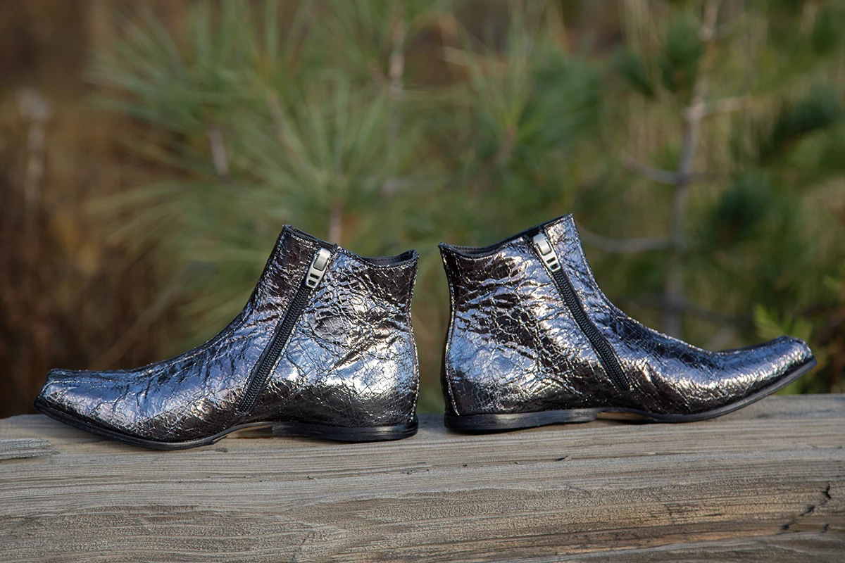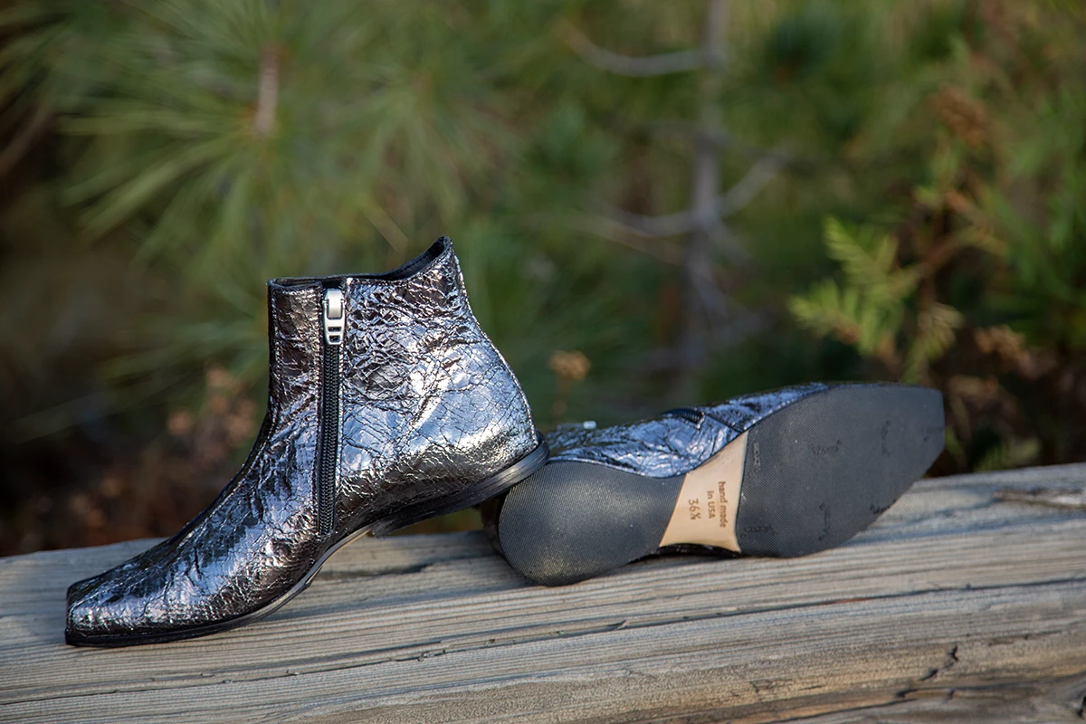Handmade in California. I am in love with this antiqued silver leather from Italy! I could wear it every day with literally everything! This new Domain bootie has an interior zipper that makes her so easy to slide on and off. Interior leather lined and rubber on the outsole for sure footing. This lightweight bootie has the best arch support too. I love wearing her bare foot as my foot feels like its getting a massage as I walk! Dual seams up the front of the boot is so chic and flattering. Wear her with cropped pants for a flirty skirt to show her off. The party and all eyes will be on your glamorous kicks!