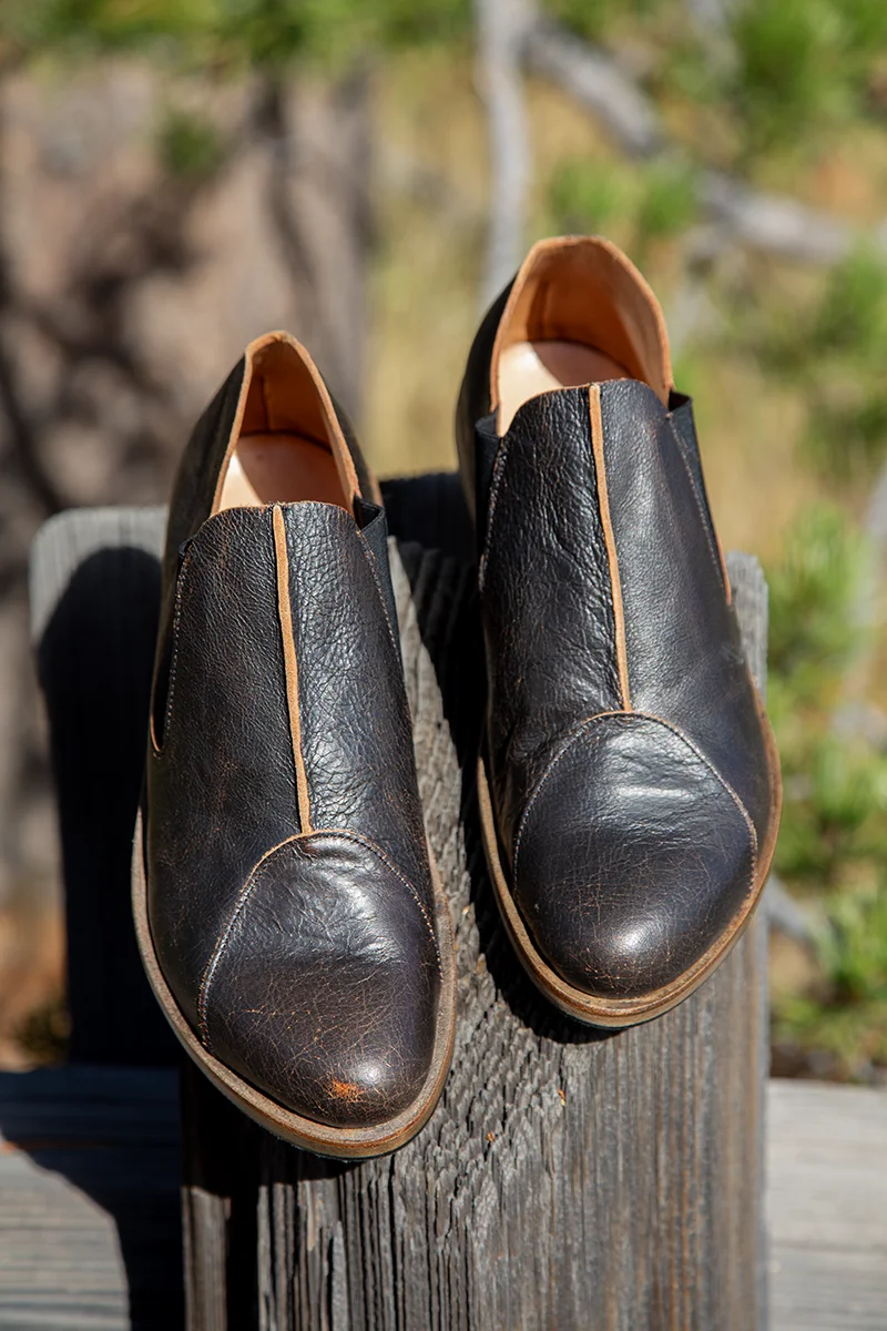 Made in California. This new style, Prevail, is gorgeous from all angles in her stunning leather from Italy. The antiqued leather wraps around both sides and we love the exposed seams that show her architectural design. Interior offers Cydwoq's signature arch support and all leather construction. She's so easy to slip on and off you go with comfort and sizzling style! Rubber on toe and heel for sure footing.    $366.00