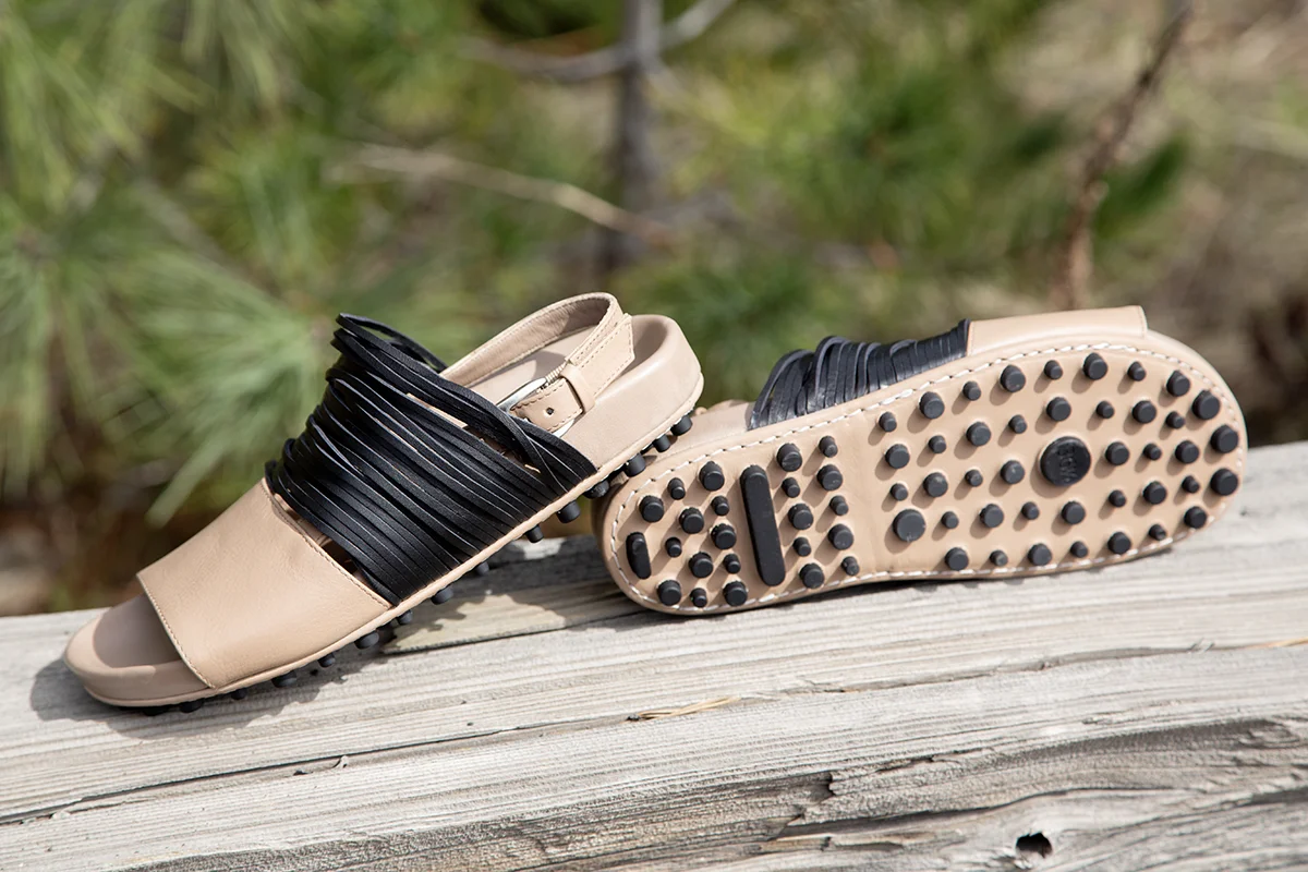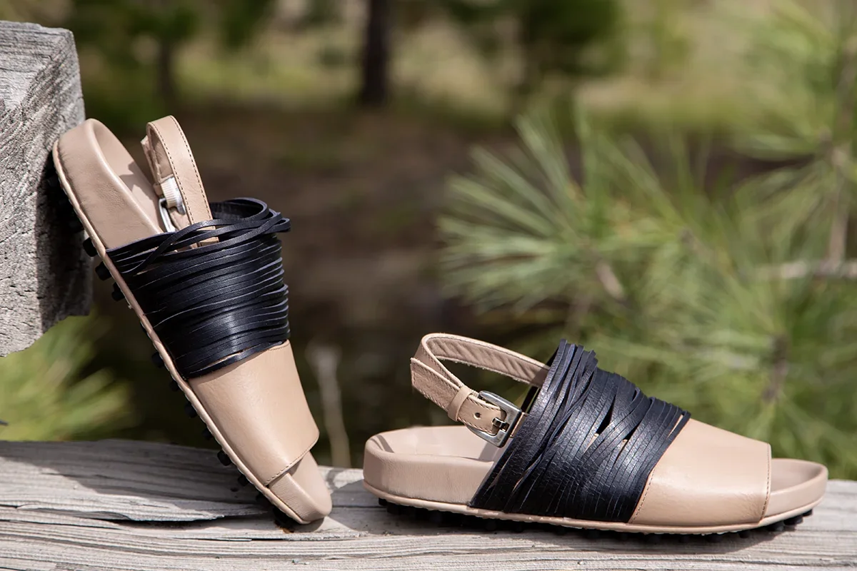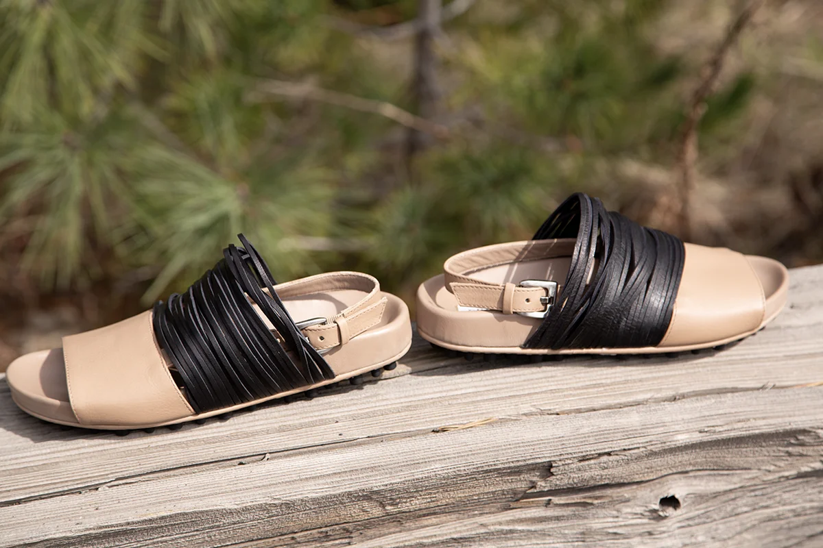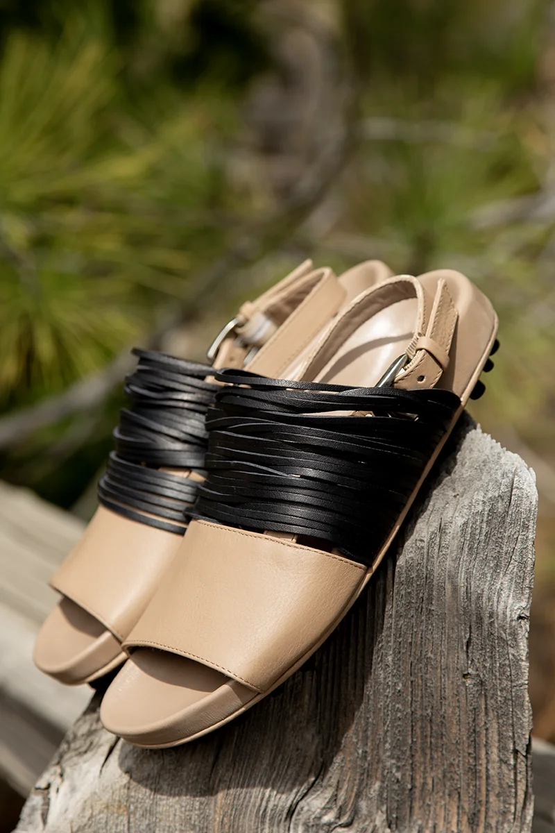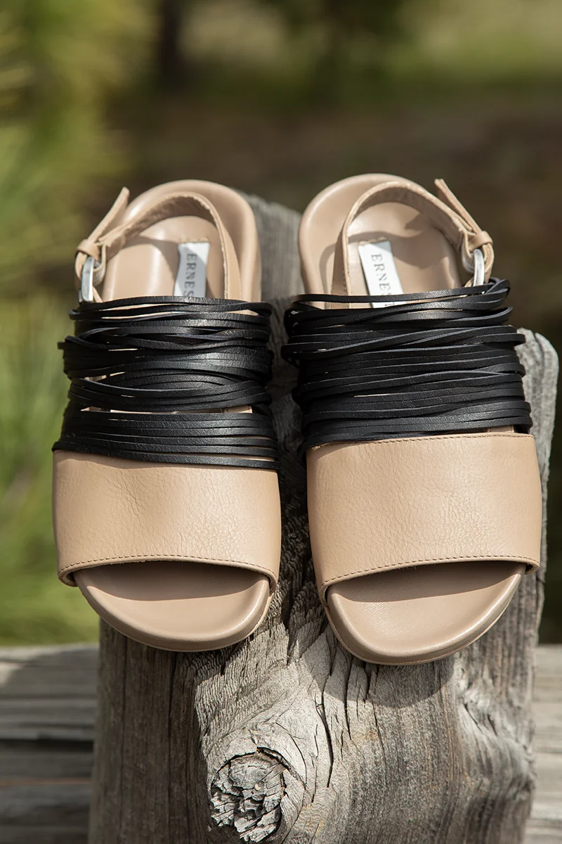 Handmade in Italy.We are excited to offer a stunning new sandal design from Ernesto Dolani. This style features multiple delicate black straps and a large sand-colored leather front band for a sophisticated look. The design includes a peep toe, a full leather construction, and a molded, padded footbed for exceptional comfort. It also offers an adjustable side buckle to ensure a secure fit. We particularly love the dotty rubber flexible sole, which adds a chic touch to this neutral and timeless modern design. $328.00