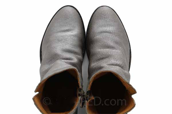 Made in Italy. Metallics are all the rage in Europe and this trend is not going away! This lovely Chill booties is constructed of skived silver leather - think tiny slices in the top grain of the leather. The Italians are keen on unusual treatments of leathers and this is perfection! Chill's leather boot shaft is 4.5" in back and inside zipper is a cinch to get on and off. 1" stacked leather heel and full rubber sole. Get chillin' in the CHILL booties!