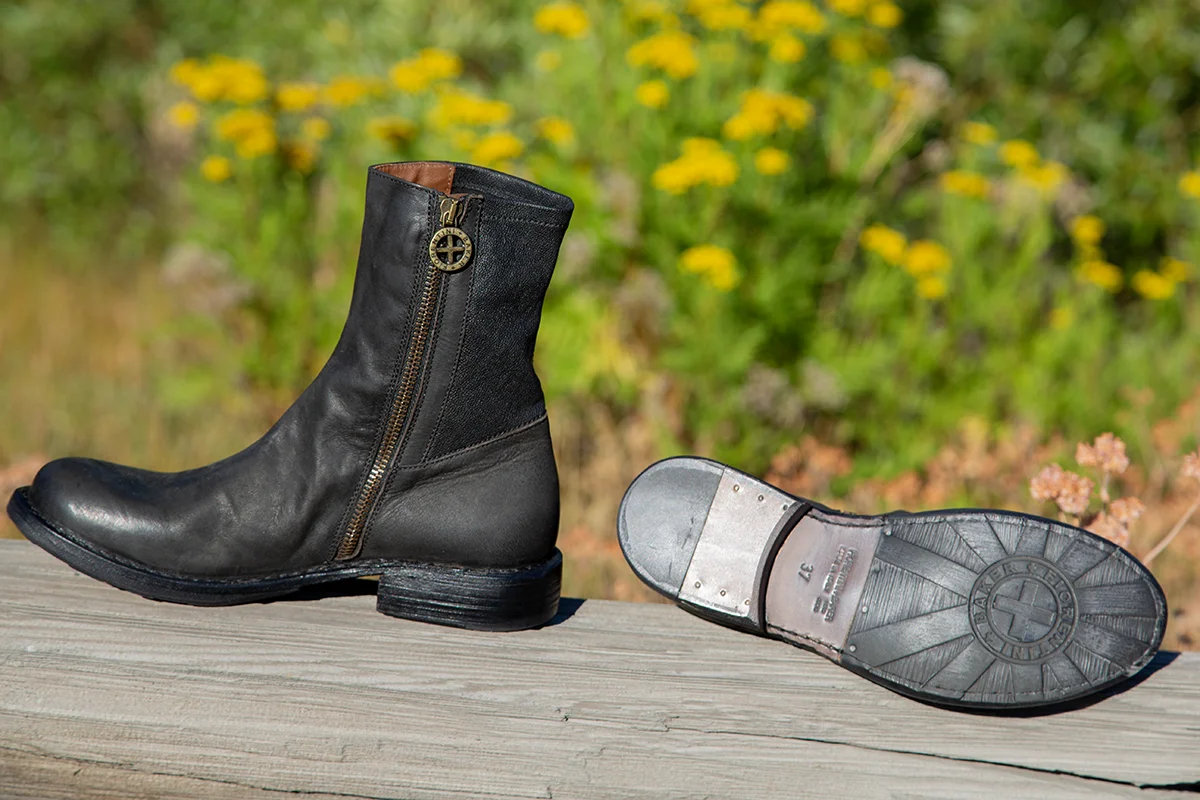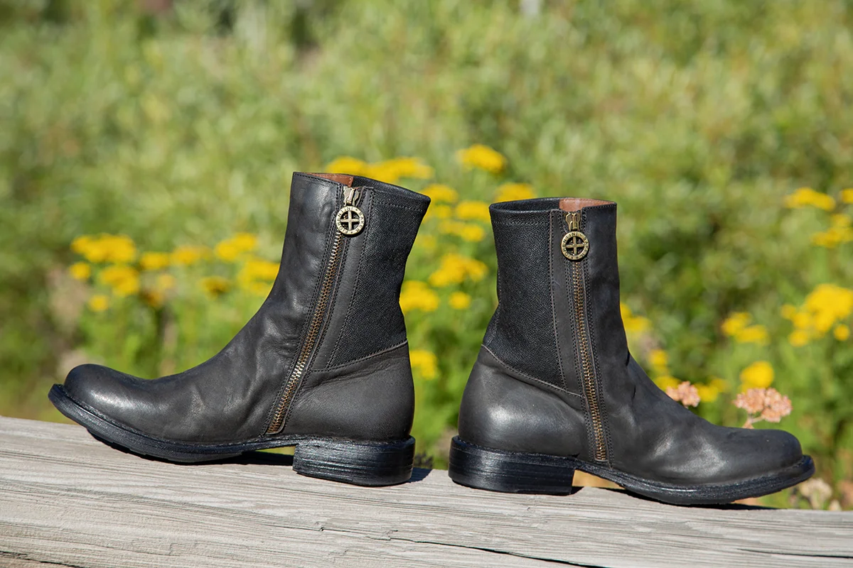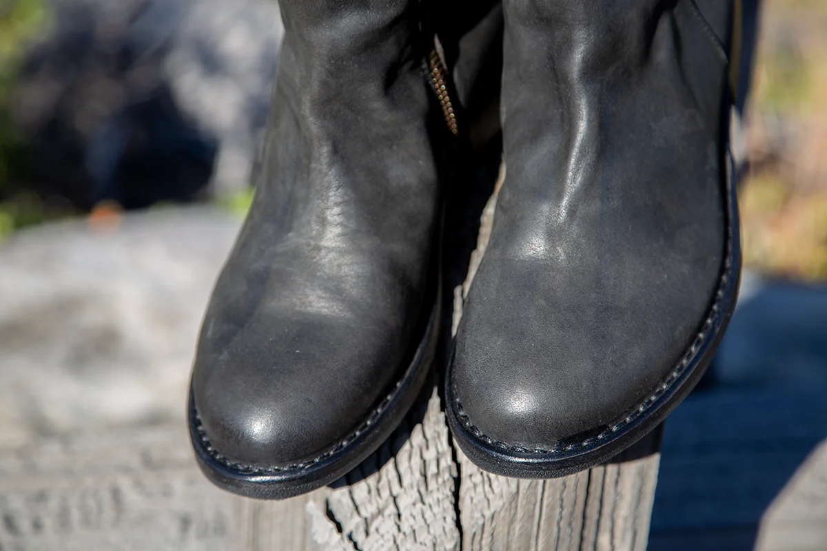 Handmade in Italy. Emery is our new bootie obsession! Simplistic yet modern with clean lines. Emery offers an interior zipper and has the coolest stretchy suede on the back. This makes her a breeze to get on and off, not to mention a nice, clean fit on your ankle. Delicious oiled dark smokey grey-black leather and stretchy back panel, make Emery a "must have" in your closet. 1" stacked leather heel with rubber on sole. Leather shaft rises up 7" high. Emery will be your new BBF with her versatility, styling and comfort! $458.00