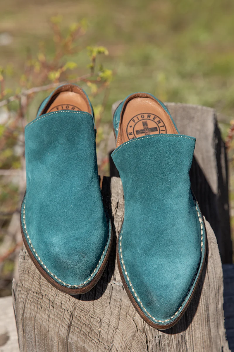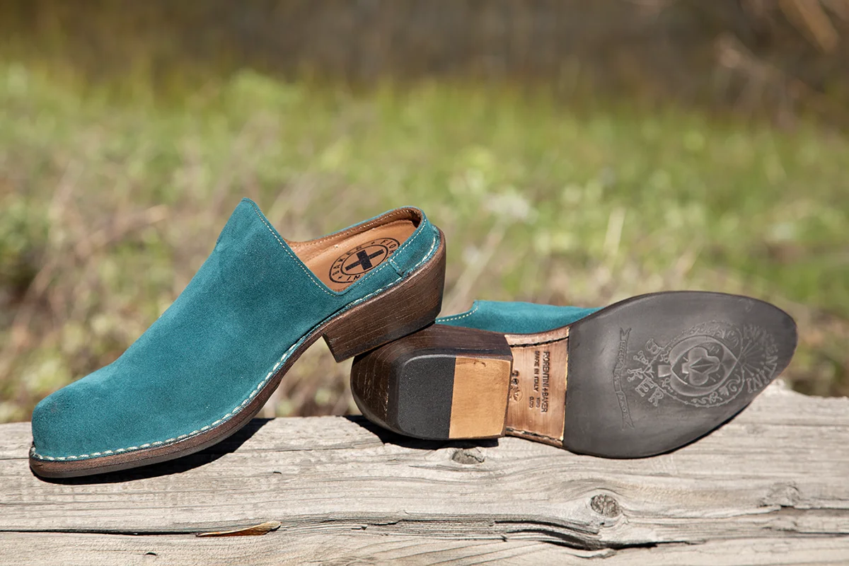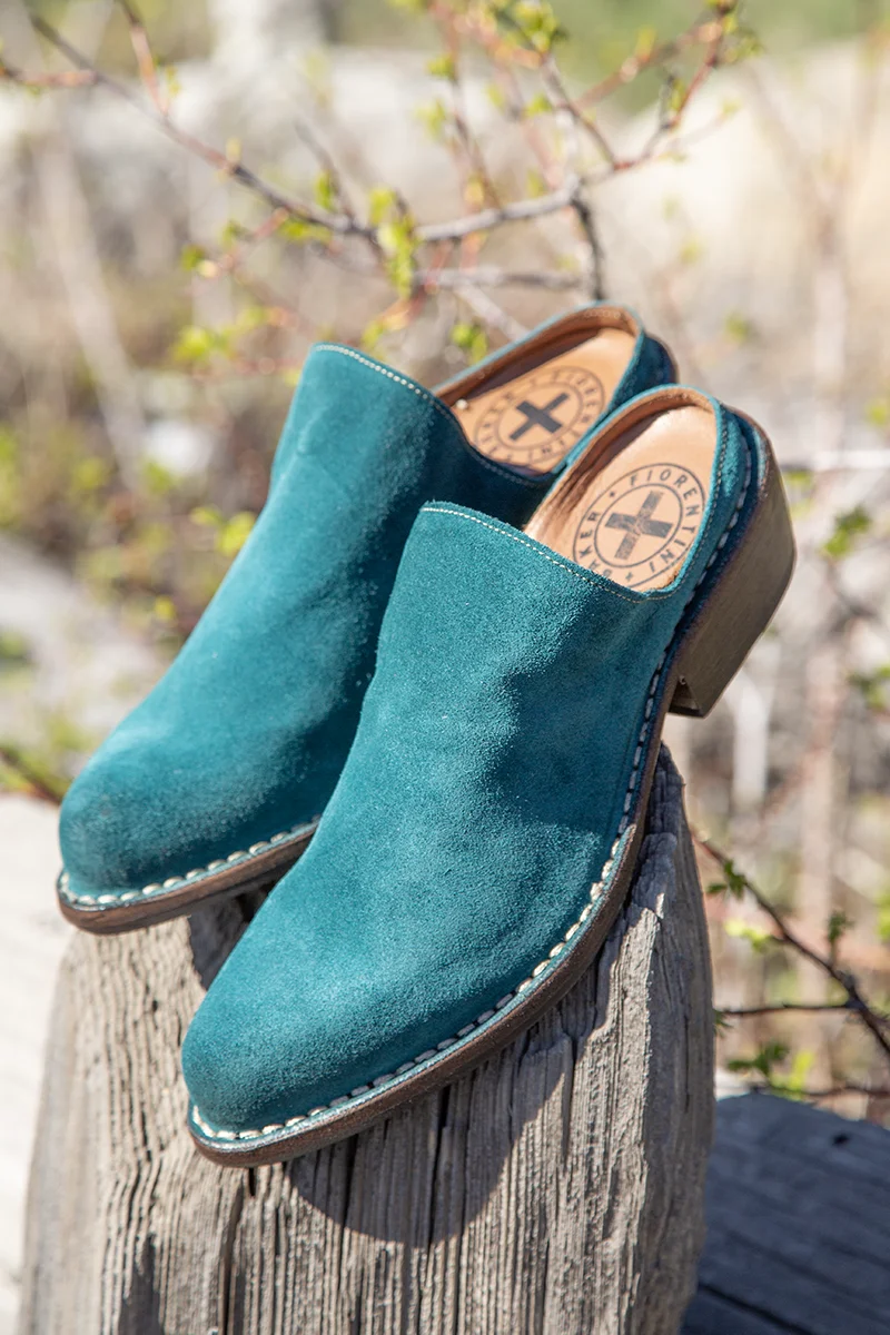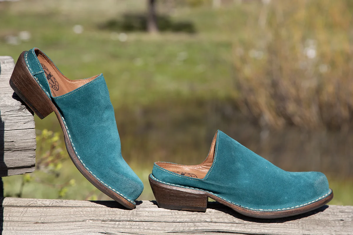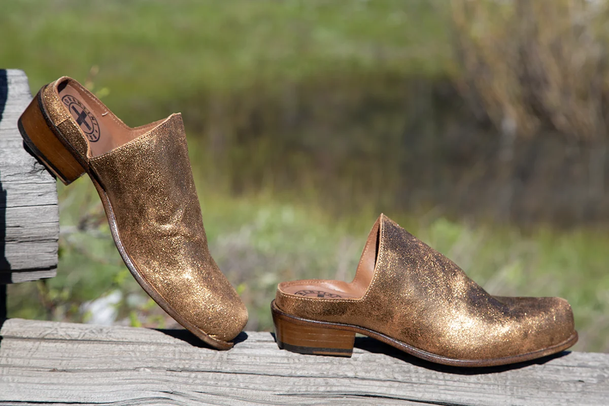 Handmade in Italy. Ah, Hero is what we have all be dreaming of! The ease of a slip on Italian clog-like style that is so comfortable and shines with style. Constructed in soft teal suede or sparkly gold leather, your soles and style will thank you. Upper design will hug your feet and little back leather lip will hold your feet in place. Smooth leather lined with 1.25" heel. Western flare with an Italian twist! $398.00