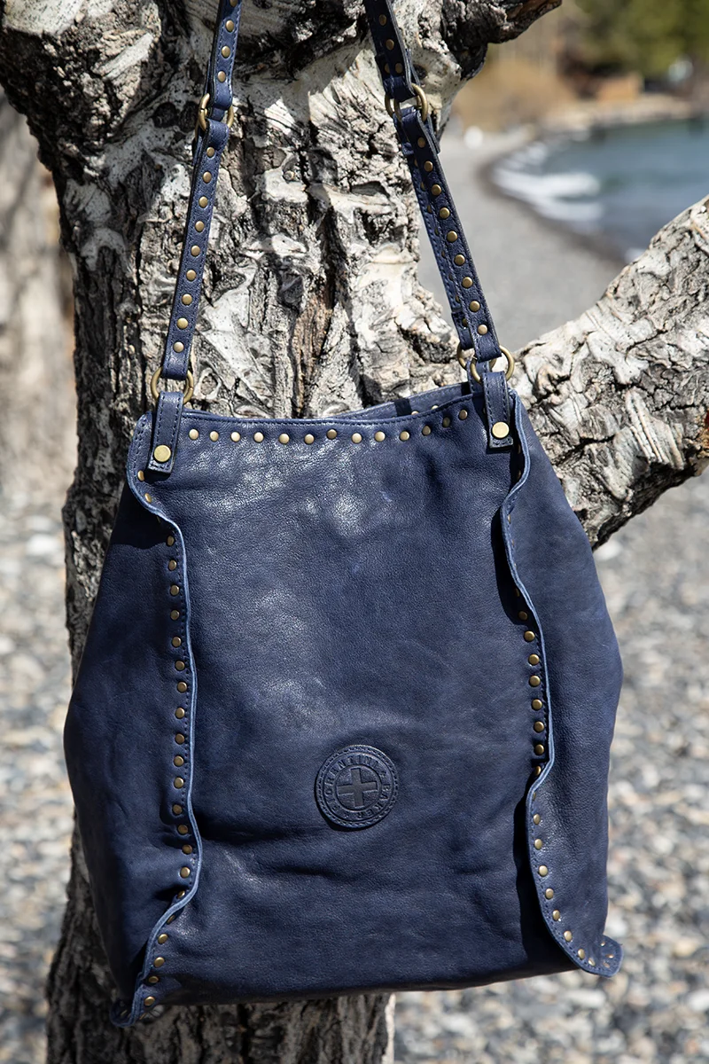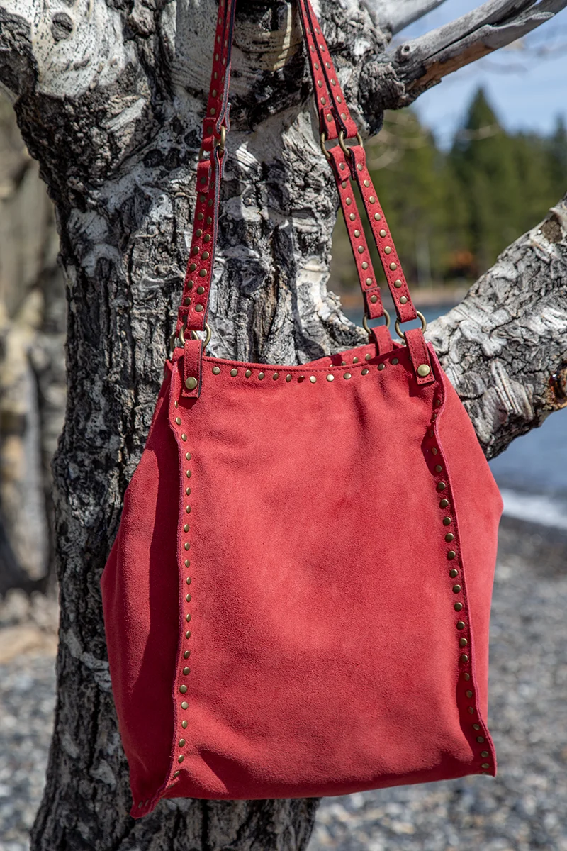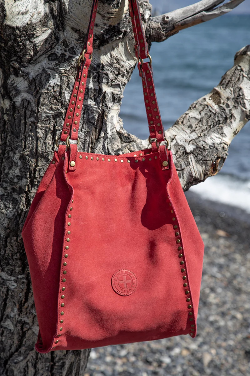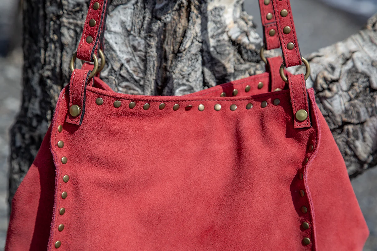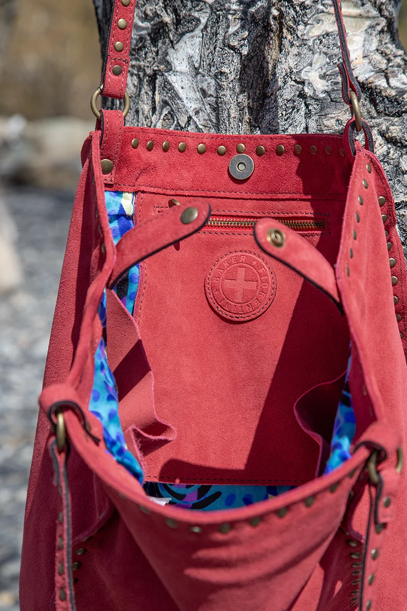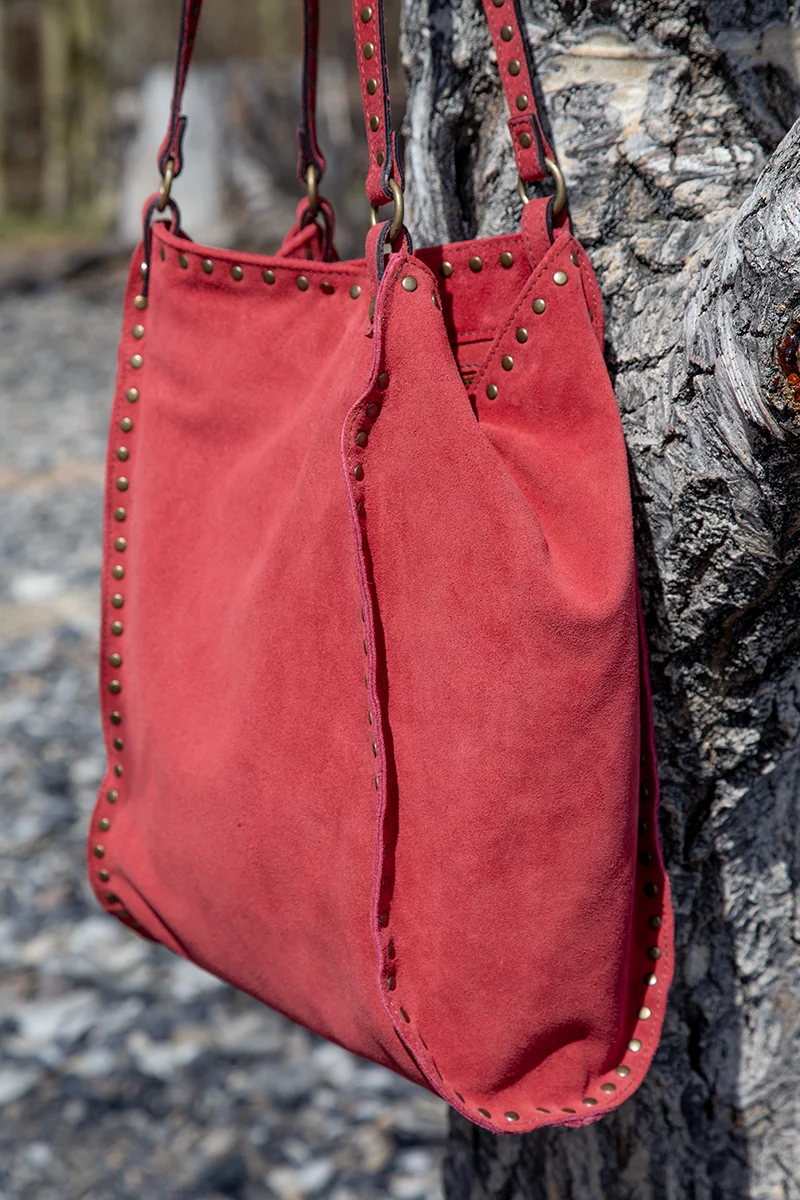 Handmade in Italy. It's like hitting the jackpot when we get more Fiorentini and Baker bags! Constructed of beautiful soft Italian blue leather or lipstick red suede with hand studded edges. This "hold everything" bucket bag is nice and deep with a leather tab and snap closure. Inside zipper pocket is perfect for your phone and other little items. Double leather straps with studs and rings has a 14" shoulder drop. Easy to swing over your shoulder and off you go in fine Italian style! Dimensions: 17" H x 19" W. Top with snapped closed is 9" W. $518.00