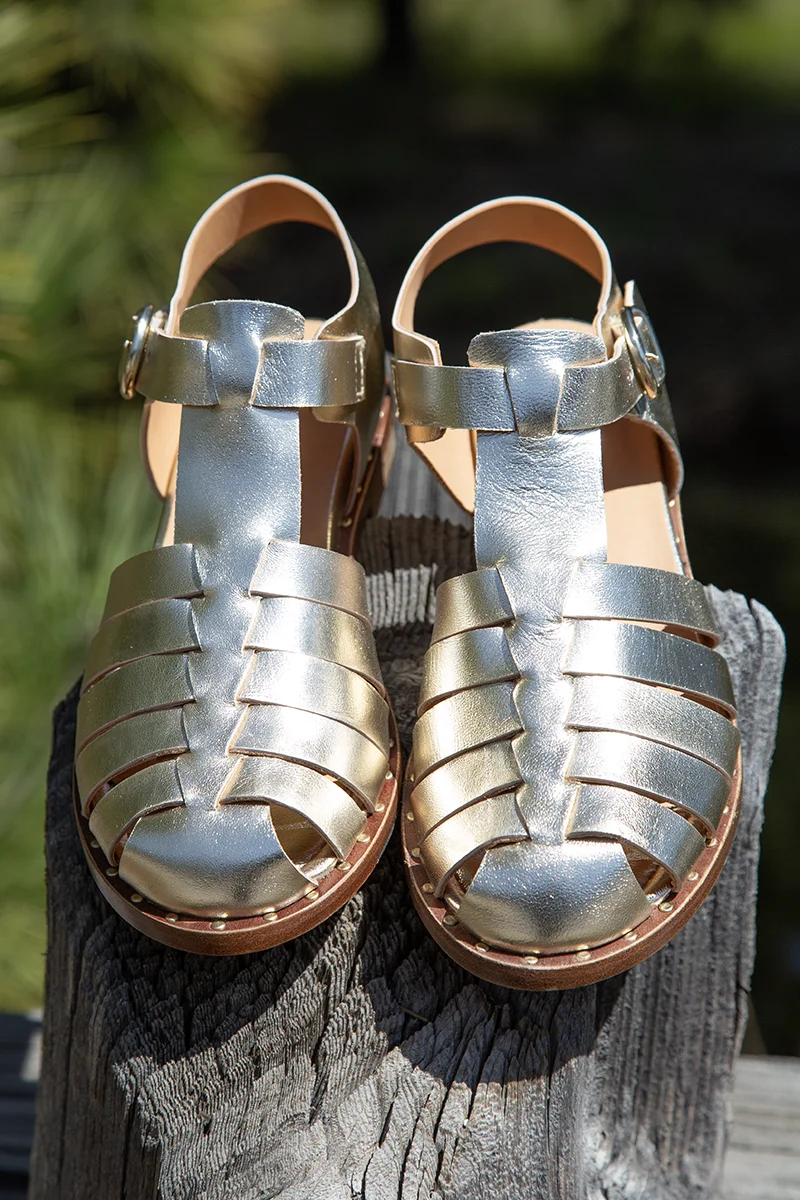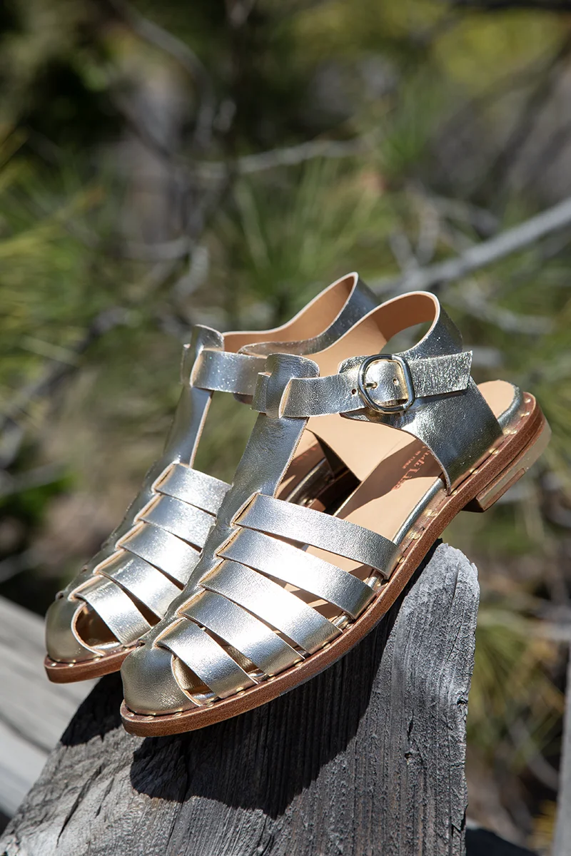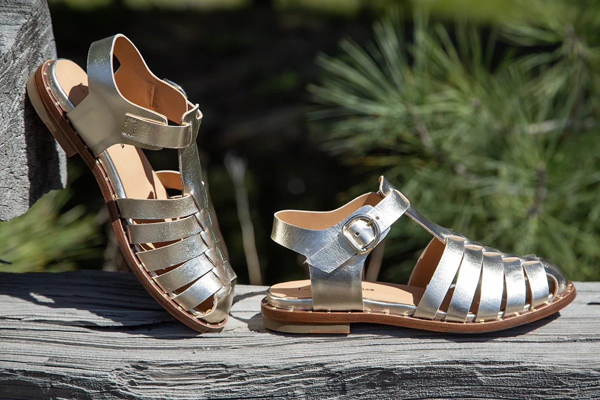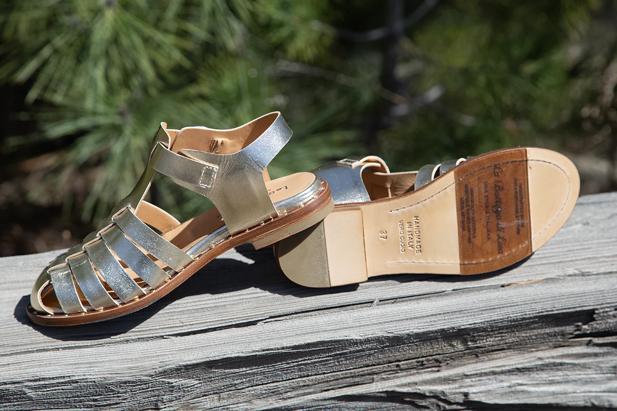 Handmade in Italy. We are so excited for this delivery from La Bottega Di Lisa! They are a family run factory in Italy, named after their late sister, Lisa. These designs are beautifully constructed. However, I specifically have my eye on the Katerina, a stunning platinum gold strappy fisherman sandal with studded edges. This style is easy to slip on and features an adjustable side buckle. The toe box is comfortably wide with a breezy feel, and the T-strap looks great either barefoot or paired with fun socks. For added comfort, it features a leather-lined, padded footbed. The leather outsole also includes a rubber inset in the front for anti-slip traction. These will be perfect for any upcoming special event! $418.00