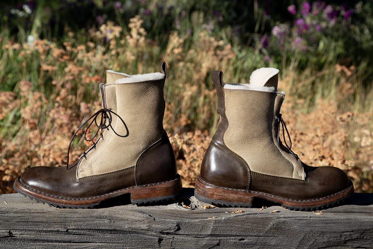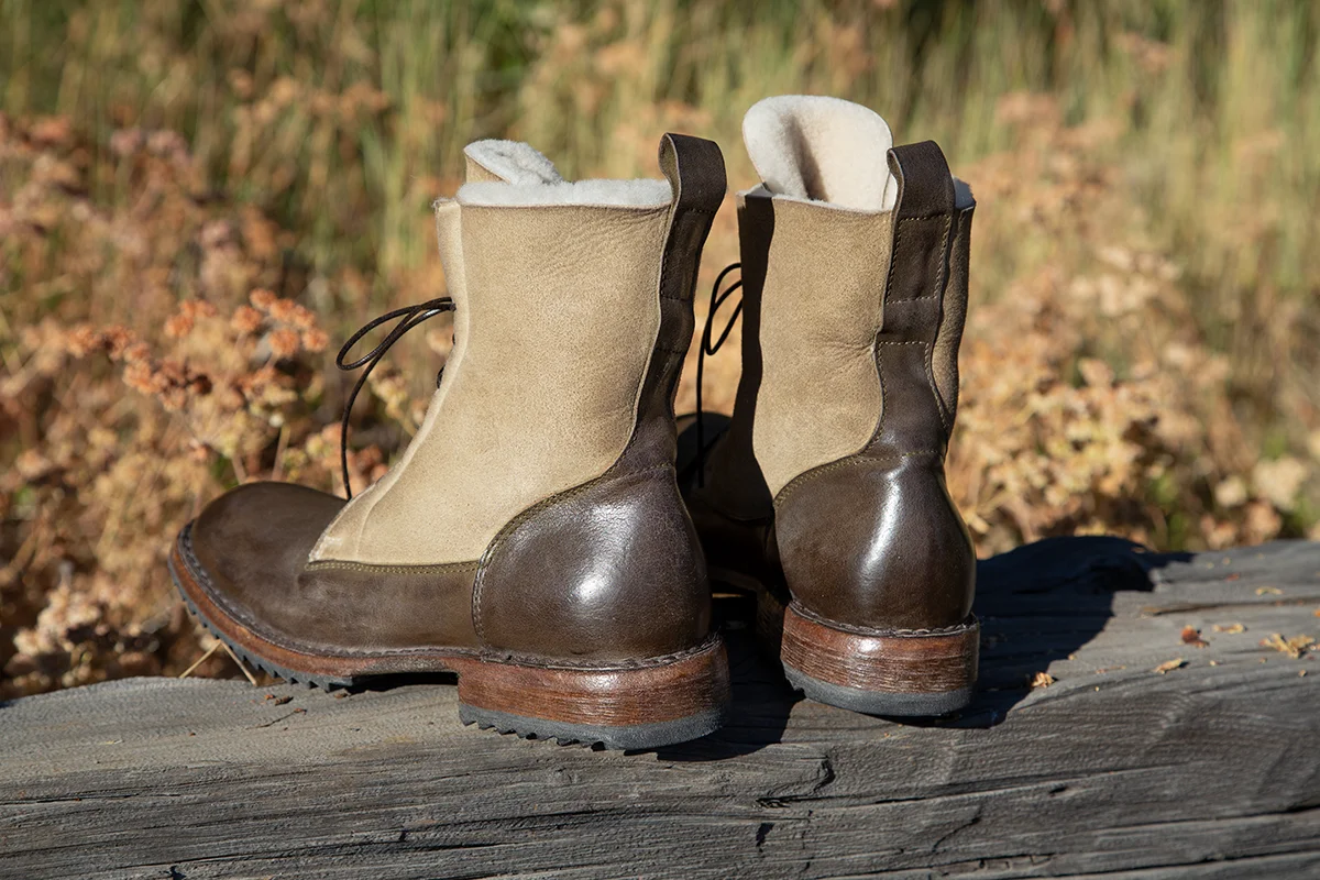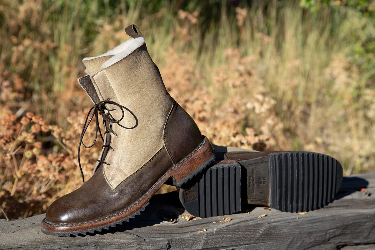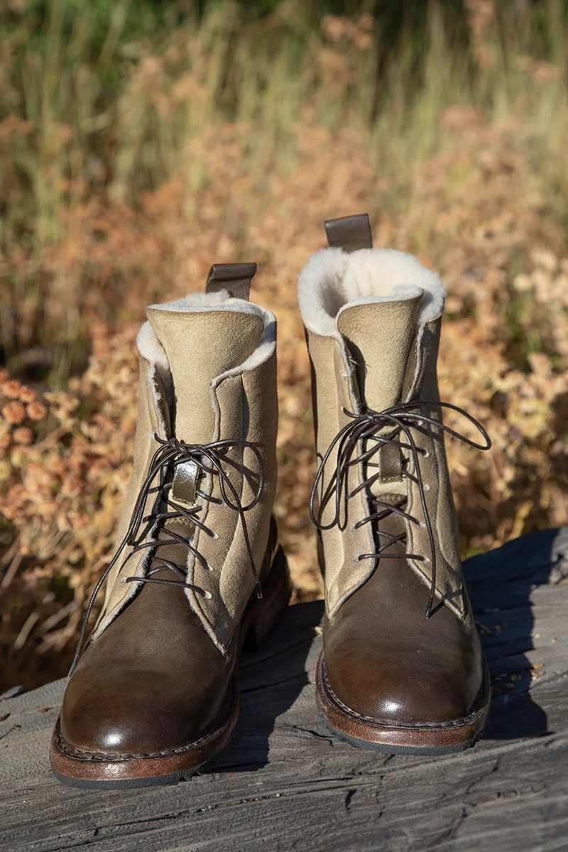 Handmade in Italy. What a gorgeous, cozy boot from the Italian brothers of Moma! This new Sierra boot is constructed out of olive brown leather toe and heel with a super soft cream fleece lined interior. Comfortable rounded leather toe box and leather lined foot bed. Boot shaft is 6.5" high with 1" stacked leather heel. Upper is double stitched to the leather and rubber outsole. Sierra in one hearty boot that will be great in cold, wet weather. Your feet will be so cozy and comfy for your winter walks! $528.00
