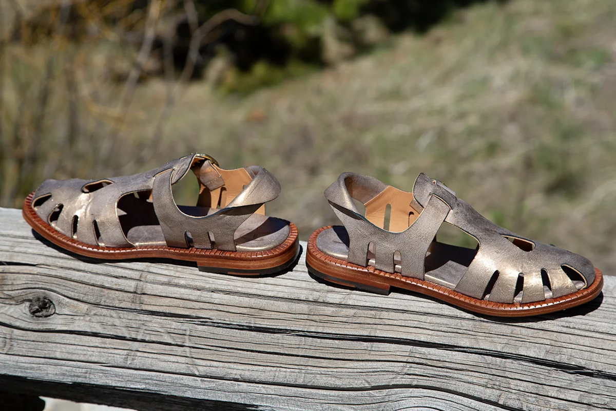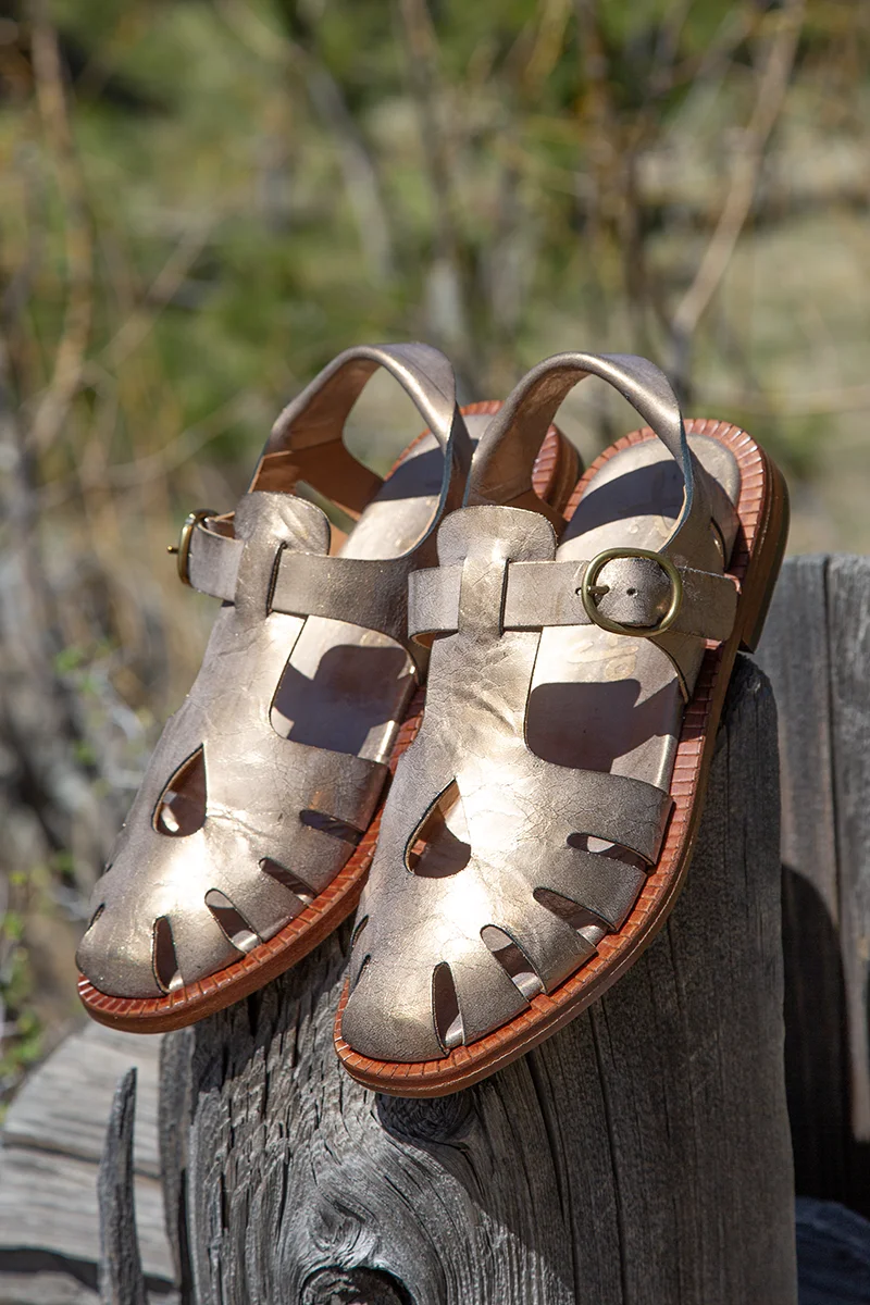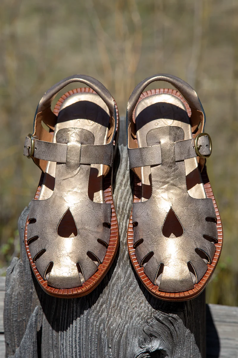 Handmade in Menorca, Spain, our wonderful new style, Amora, is crafted from Pep Monjo’s signature antique gold leather. Designed as a sandal-shoe, it features creative cut-outs, a roll-back heel strap, and an adjustable side buckle. We especially love the teardrop cut-out at the top. For maximum comfort, the Amora is leather-lined with a padded footbed, while the leather outsole includes crepe rubber for anti-slip traction. We are sure you will love Amore's versatility and comfort. $328.00