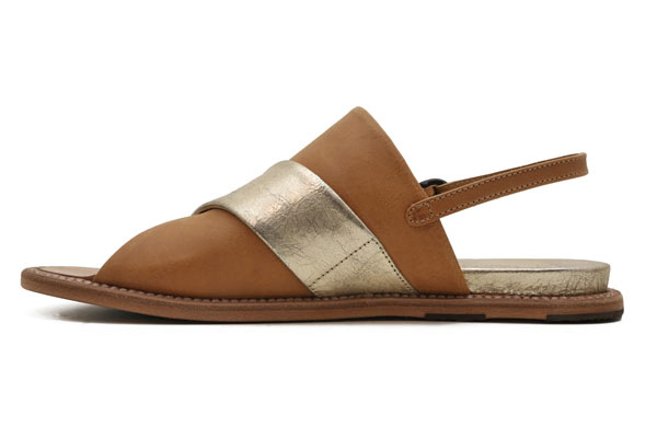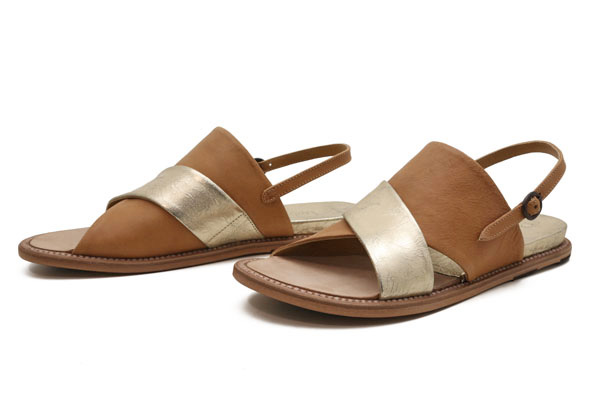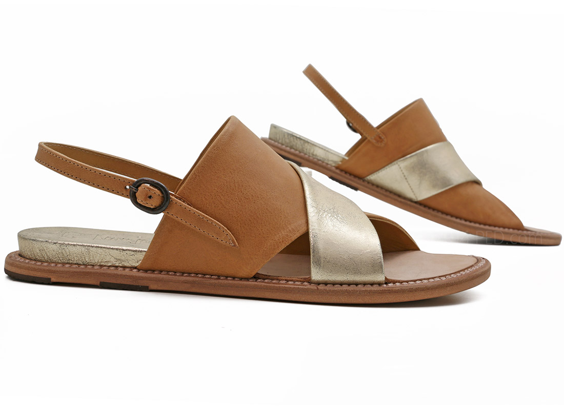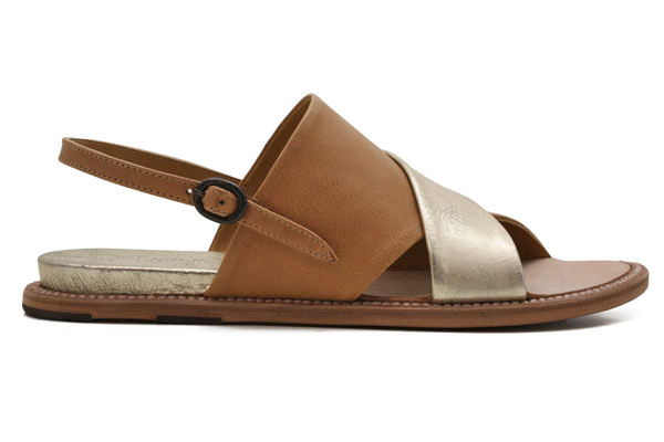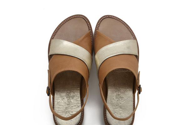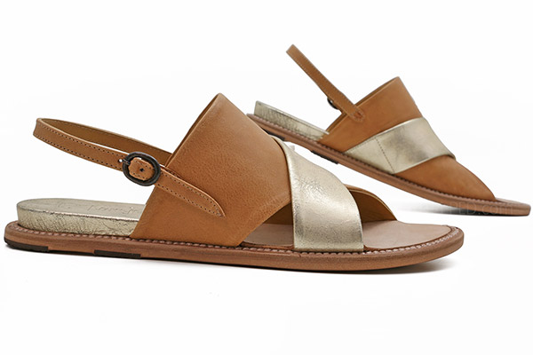 Handmade in Menorca, Spain. Constructed of buttery caramel leather and platino - think gold meets silver - leather. Slip on this bold criss cross lovely and easily buckle her up on the outside ankle strap. Open toe box and comfortable wide fit. Platino leather inset lifts you just a pinch in the heel. Leather outsole with rubber crepe set in for a smooth ride!