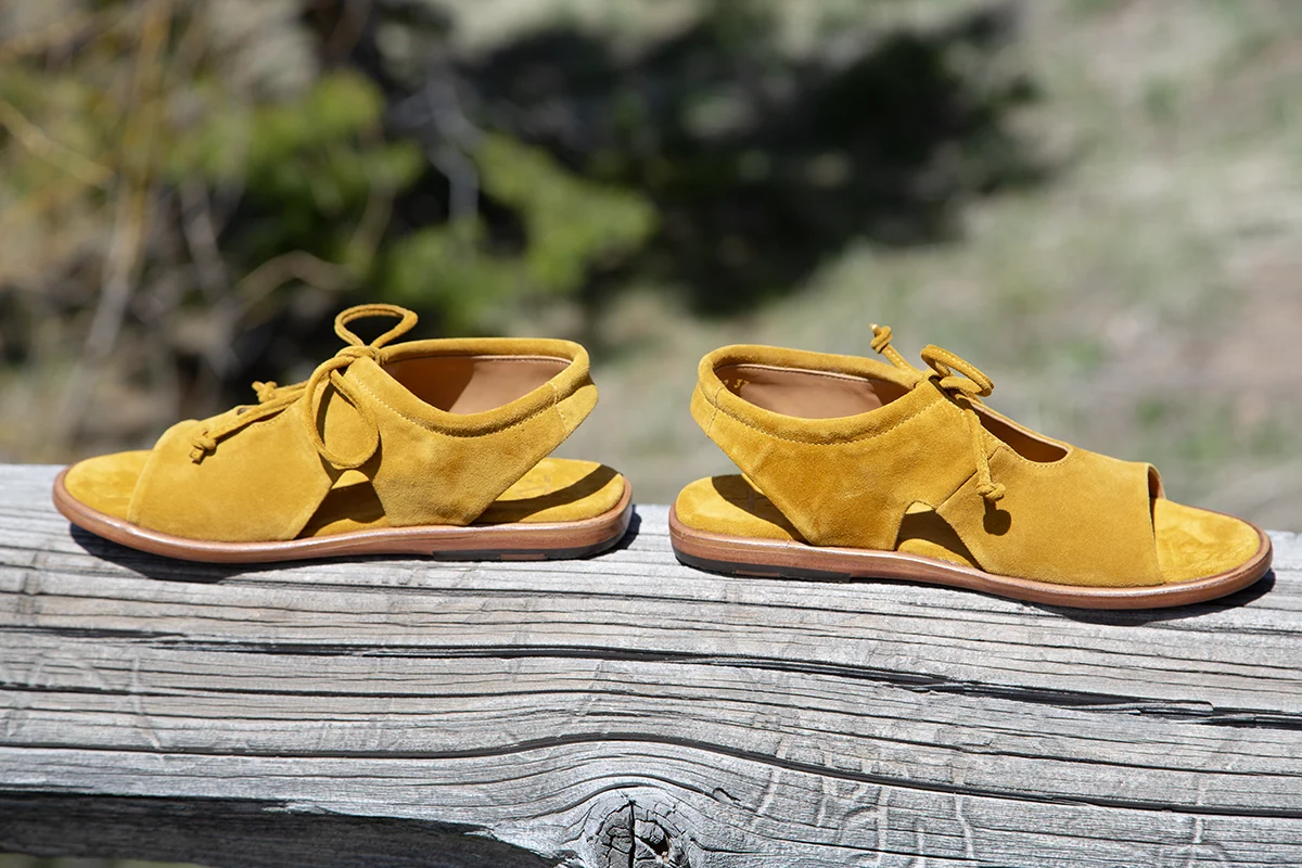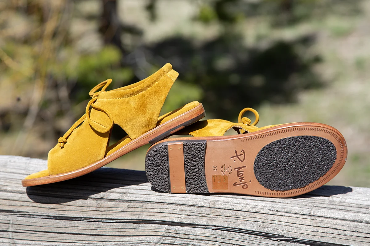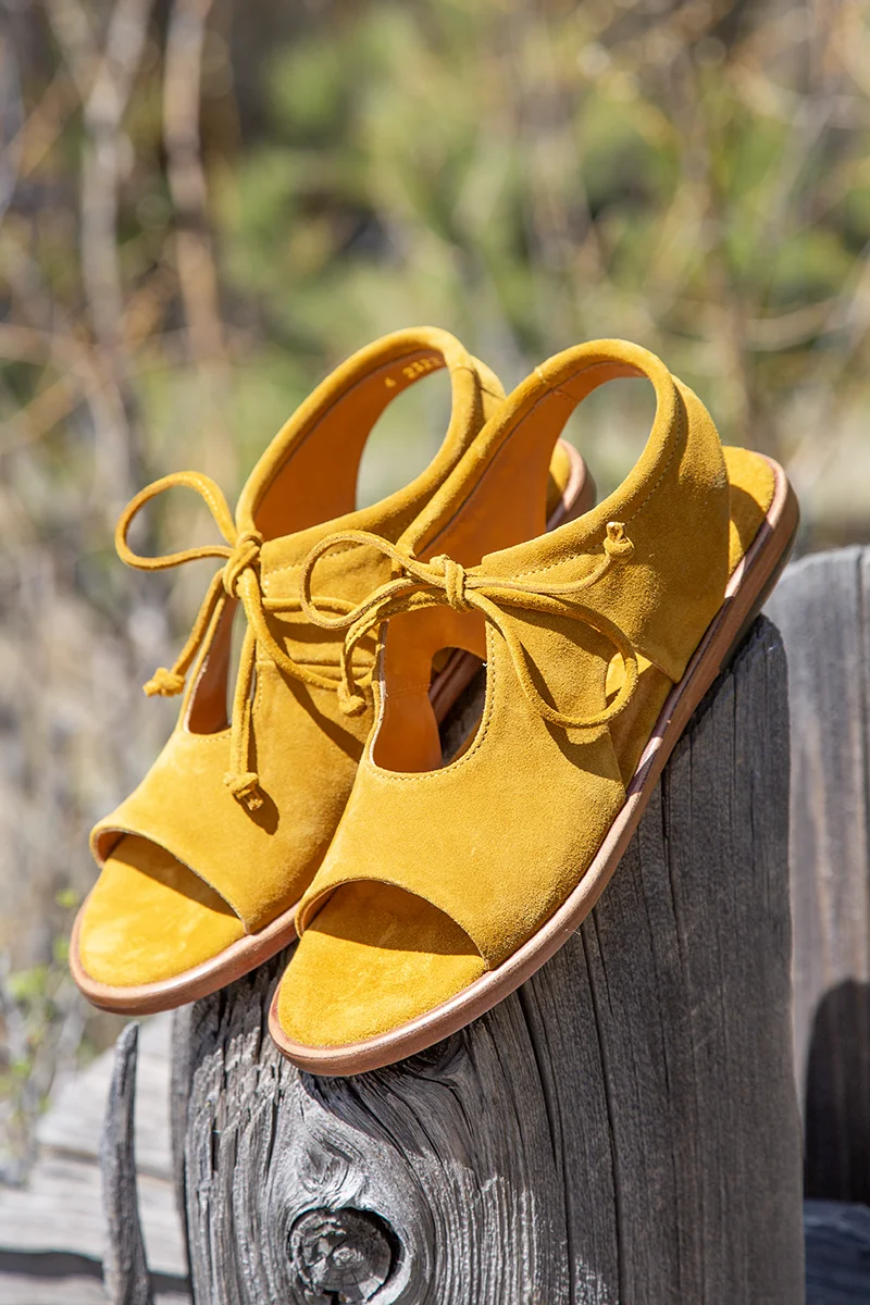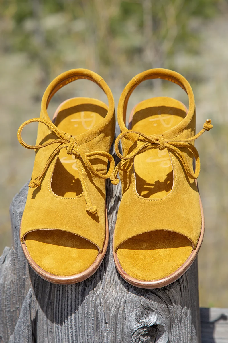 Made in Menorca, Spain. The new Isla sandal will make you feel like a Greek Goddess and guaranteed to make your style sizzle! Constructed of super soft mustard yellow suede, slip her on and the tie top is adjustable. Comfortable rounded toe with a peep toe, sides and top cut outs. Your feet will feel secure in Isla as well as enjoy the breeze on a warm day. Leather lined, padded foot bed is so comfy. Outsole is leather with rubber inset for anti-slip. $318.00