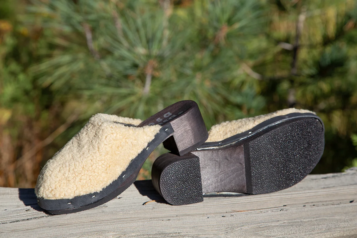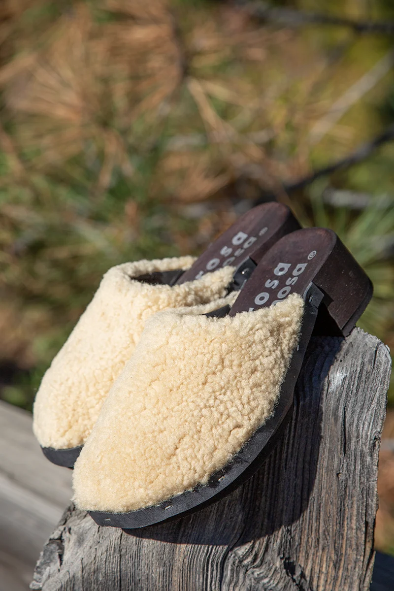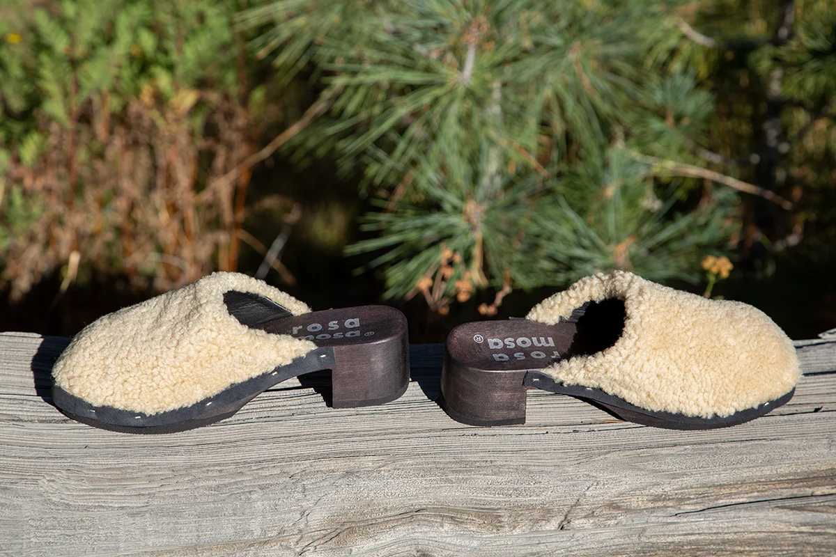 Handmade in Austria. Rosa Mosa creates our absolute favorite clogs and this new Carly Curly Clog is no exception! Constructed out of "miele" light honey colored Icelandic sheep wool upper that is smooth leather lined. Comfortable rounded toe box on a lightweight anatomically designed poplar wood sole. This wood sole is especially comfortable with the rubber inset into the "ball" of the foot area. This creates a flex movement when you walk unlike other solid wood clogs. Full rubber crepe sole for quiet clog walking! Heel is 2" in back and dips down to 1" in front. Easy to wear all day and into the night, they are that comfortable! $338.00