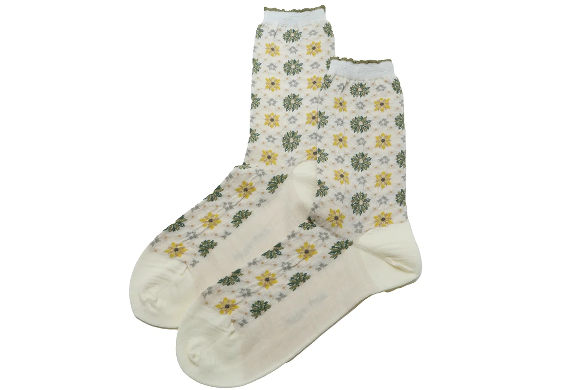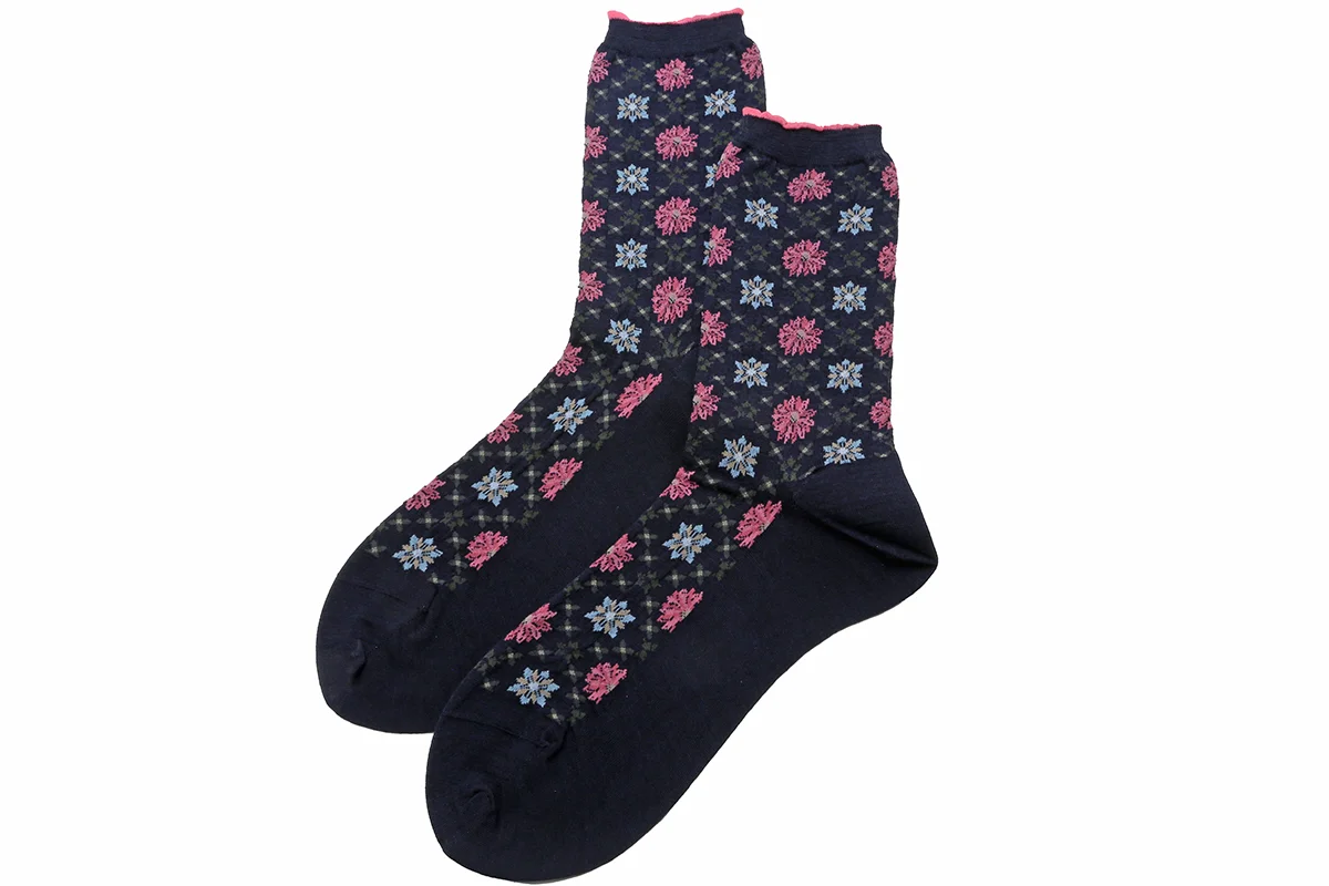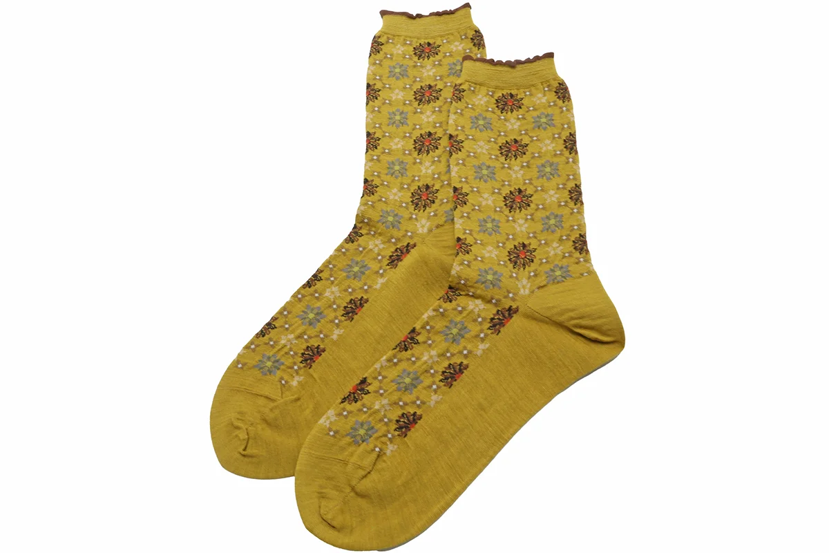 Made in Japan. This lively new textile is actually called Kaleidoscope. However, we shortened it to "Kalei". The sock textiles is so lively and colorful, just like a genuine kaleidoscope (which I love)! Dozens of colorful star bursts create a very festive look. We love the beautiful color combinations and tiny grids and dots throughout. Topped with a comfortable tiny ruffle. Heel to toe measures 9". 70% wool + 30% nylon. $40.00