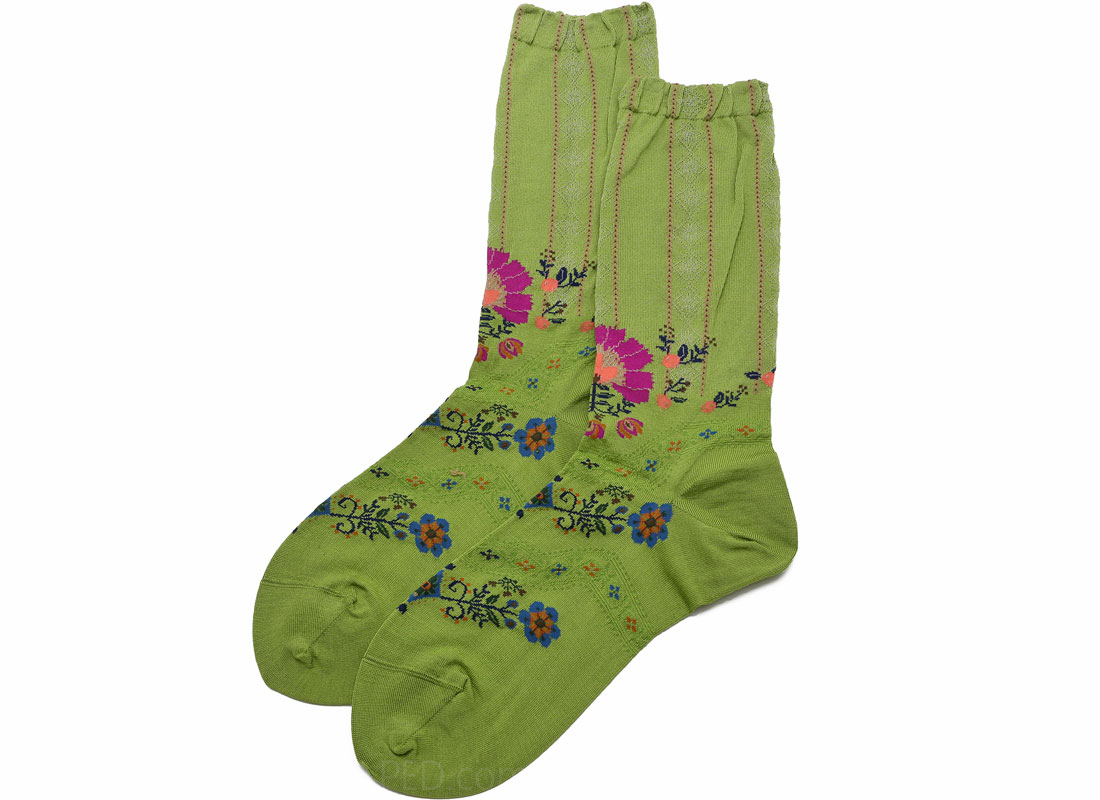 Made in Japan. These lovely sock textiles are inspired by the Mayan huipils -- embroidered blouses and dresses worn in Mexico and Central America. From the top down vertical stripes to the complex, colorful flowers, vines and lace at your ankle and feet. Stunning textile with no details left unnoticed. Comfy ruffle top and this sock is a trouser length. 70% cotton + 30% nylon.