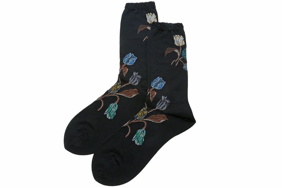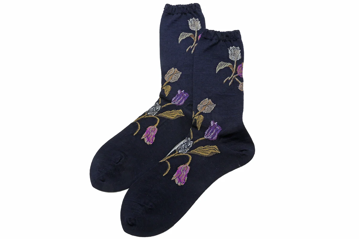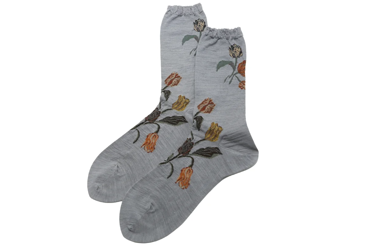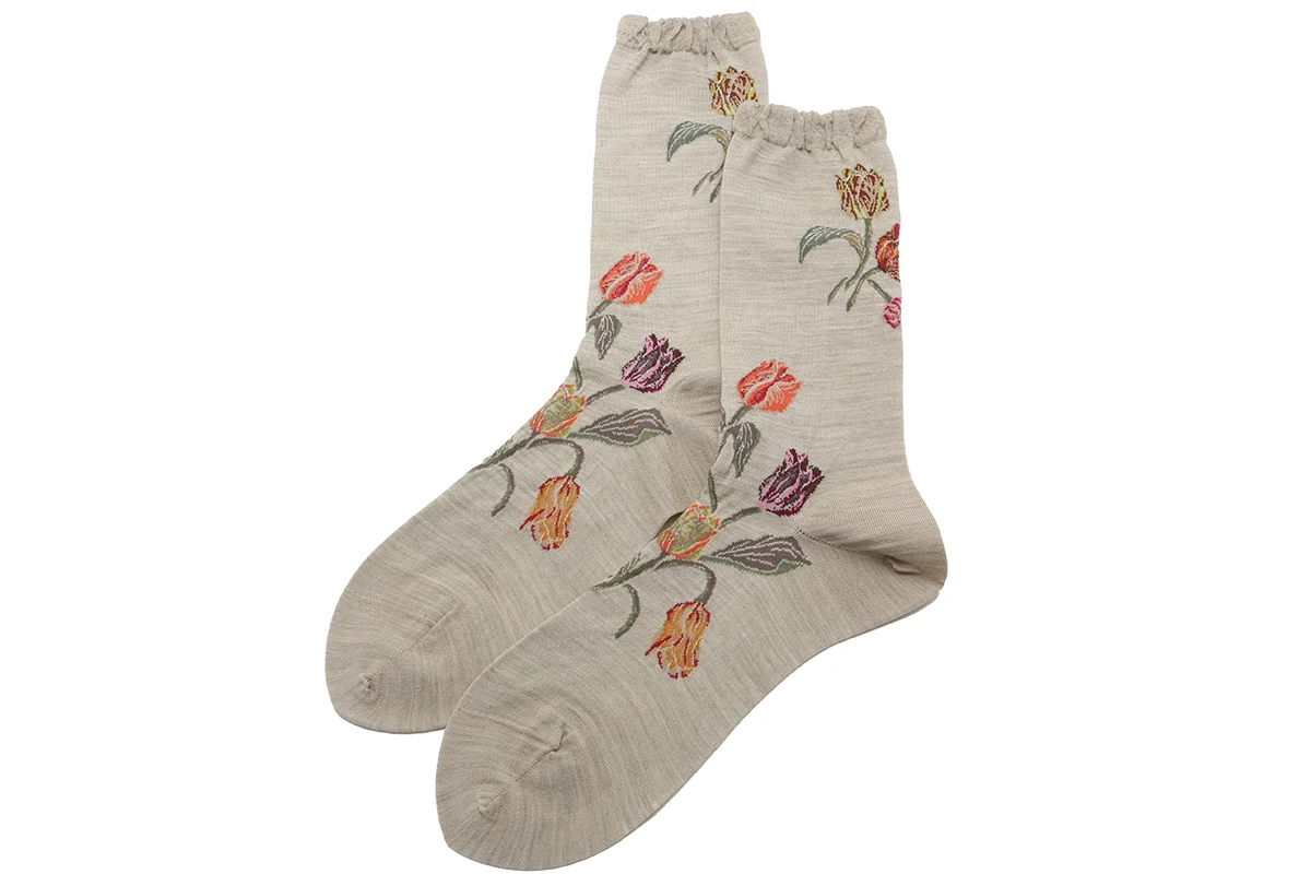 Made in Japan. Big, beautiful and colorful tulips decorate this new Antipast sock design. Complimentary colors and really detailed with the layers of colors in the tulip petals and leaves. Comfortable ruched tops and heel to toe is 10" long. 70% wool + 30% nylon. $40.00