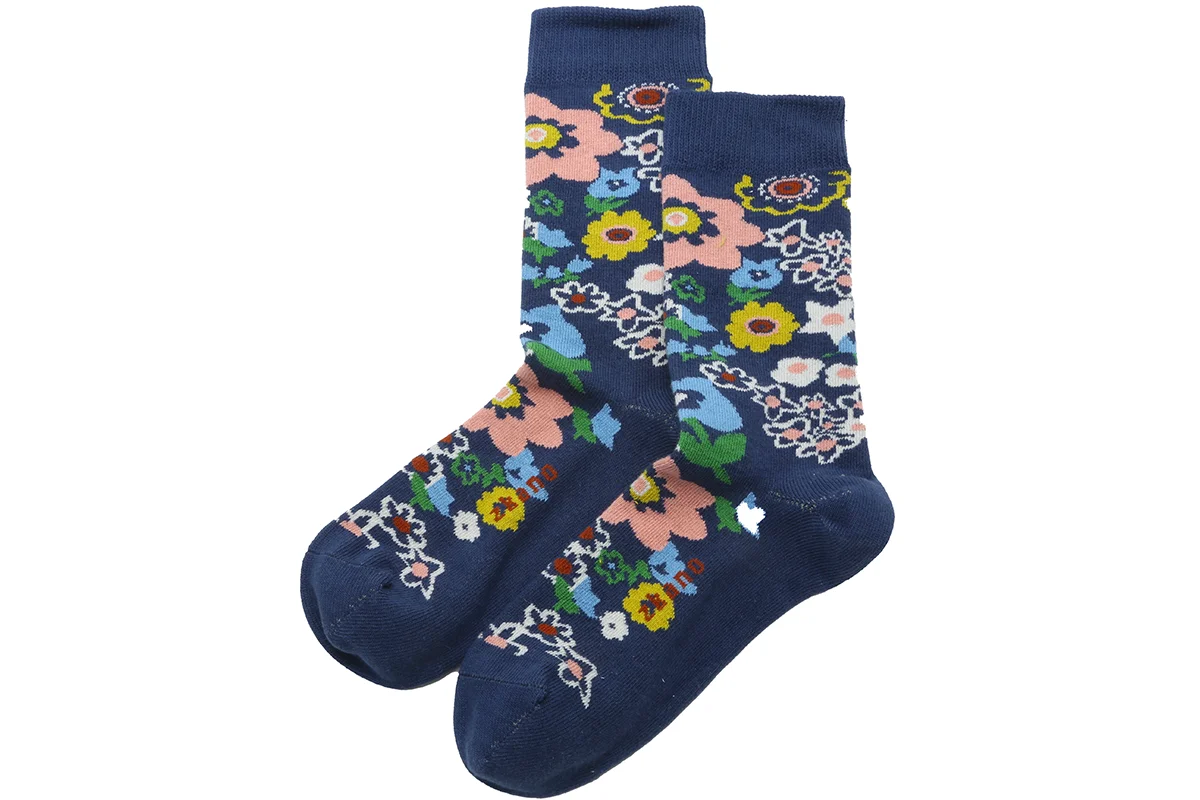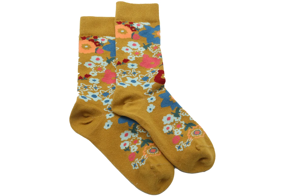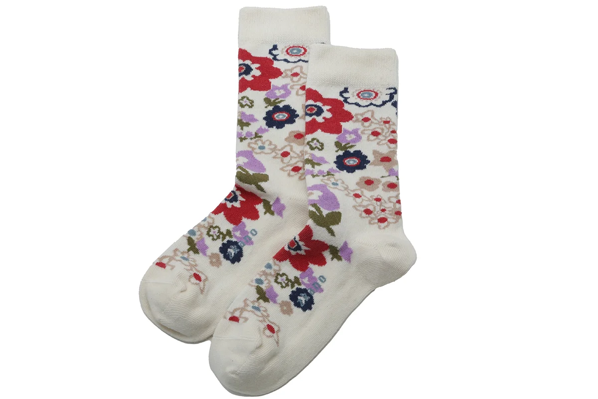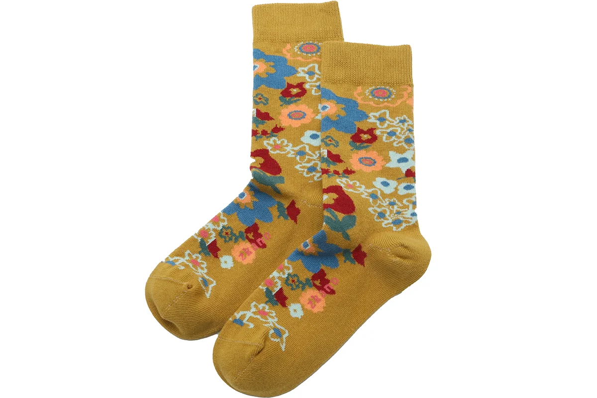 Made in Fort Payne, Alabama. Calling all you flower children! This new Garden sock style is for you! Our favorite American sock maker has created this new textile with loads of large and small flowers in so many joyful colors. Let it be a colorful day with lots of skip in your step when you have these Zkano socks on. 66% certified organic combed cotton+ 32% nylon + 2% elastic. $22.00