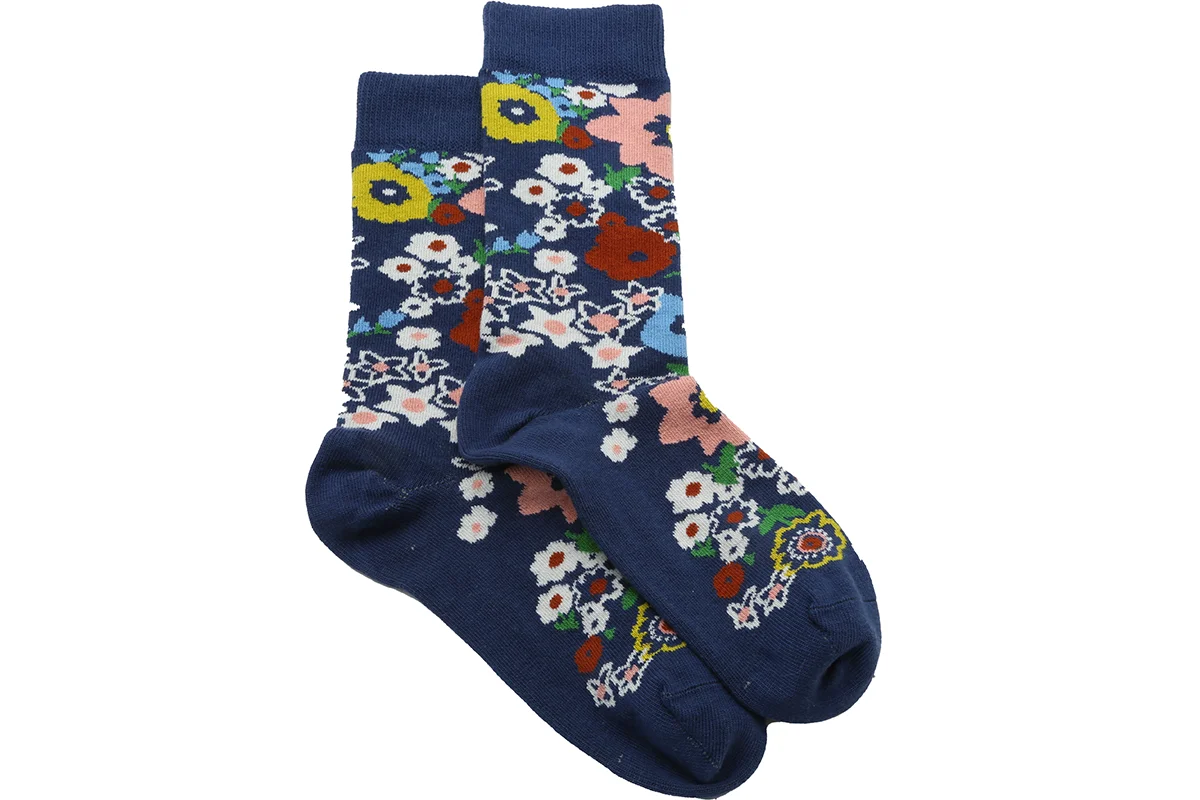 Made in Fort Payne, Alabama. Calling all you flower children! This new Garden sock style is for you! Our favorite American sock maker has created this new textile with loads of large and small flowers in so many joyful colors. Let it be a colorful day with lots of skip in your step when you have these Zkano socks on. 66% certified organic combed cotton+ 32% nylon + 2% elastic. $22.00