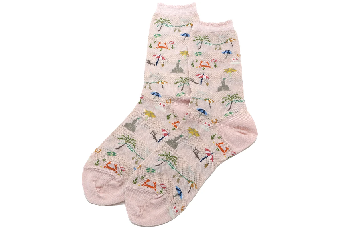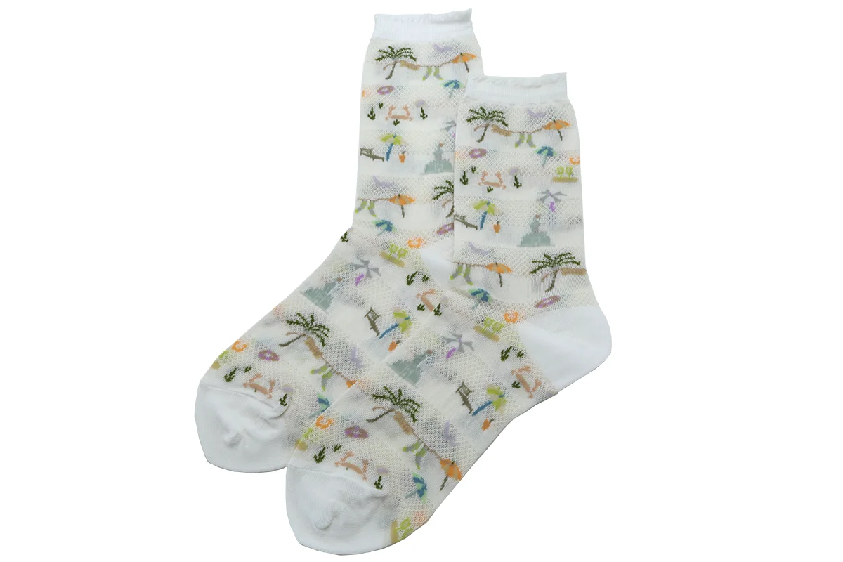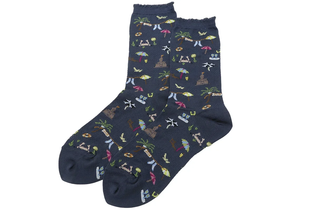 Made in Japan. Craving that warm beach vacation? Well, maybe it's not tomorrow but this new textile sure will help your cravings! This festive textile offers all the beach fun including umbrellas, palm trees, floaties, crabs, drinks, birds and sand castles. Finished off with a tiny top ruffle that is not only super sweet but also non-binding and comfy. Heel to top of sock is 8.5". 70% cotton + 30% nylon. $40.00
