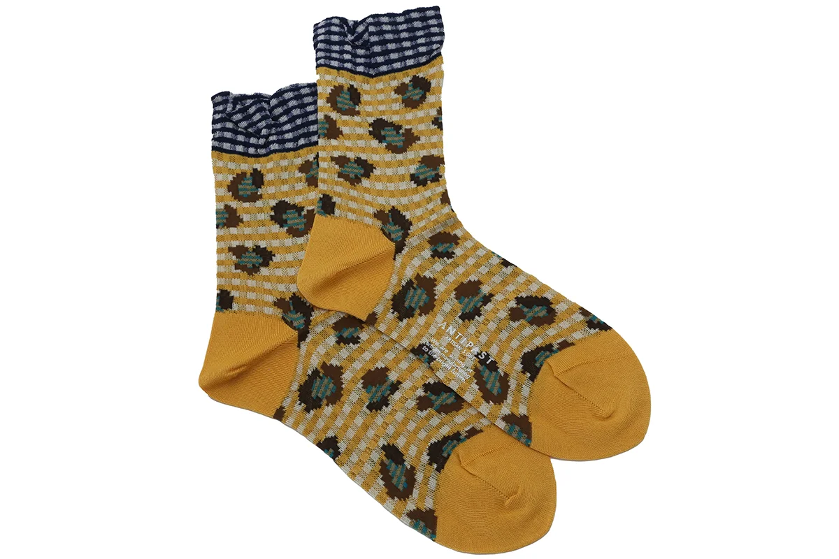 Made in Japan. This wonderful textile come in socks and anklets! We love the checked background with the pixeled leopard print throughout. A little Jungle love inspiration! The top is a comfortable, ruched and non-binding. Fun color combinations and playful socks for your sweet feet. 80% cotton + 20% nylon.