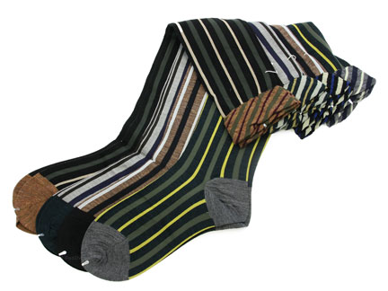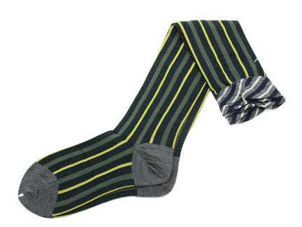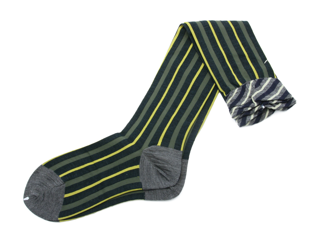 Made in Japan. Heaven knows, we love a good striped sock, but, as usual, Antipast exceeds our stripe-o-philic expectations!! What makes their new vertically striped Regimental Knee High so charming is the ruched top that suddenly shifts to diagonal stripes in contrasting colors (which echo the solid heel and toe). So funky and fun--anyone who spies your Regimental Knee Highs will have to break ranks and smile! 70% wool + 30% nylon.