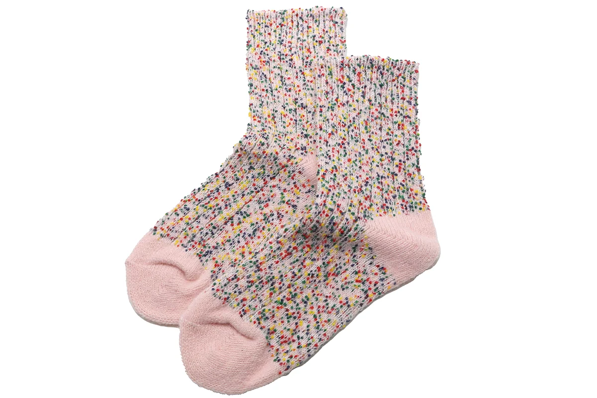 Made in Japan. Talk about a fun and festive sock design! These cozy pink socks have lots of sprinkled confetti in navy, red, yellow and pine green. Party time and your feet will thank you for you for how cozy these are. Non binding top and not itchy at all! 62% + 28% nylon + 10% wool. $38.00